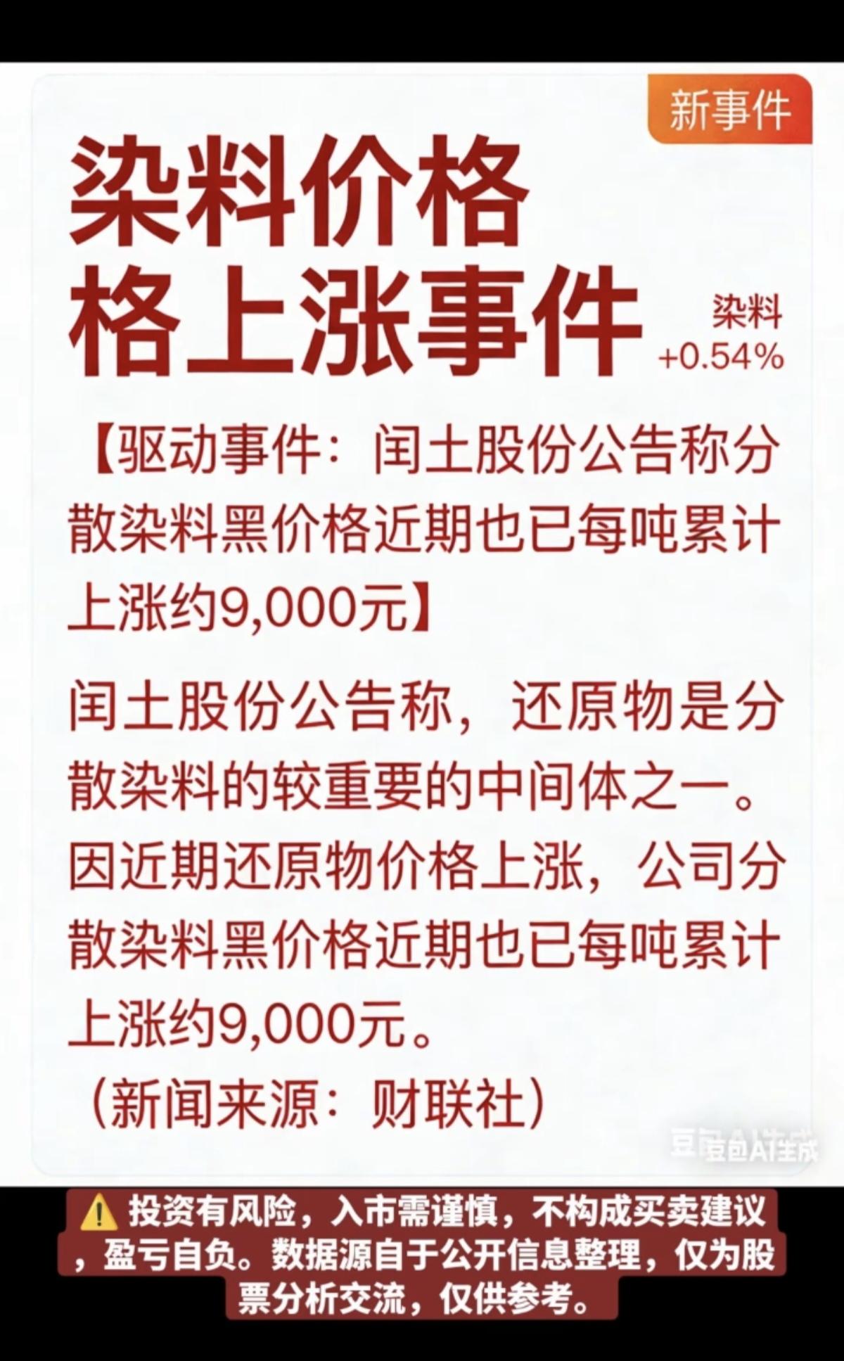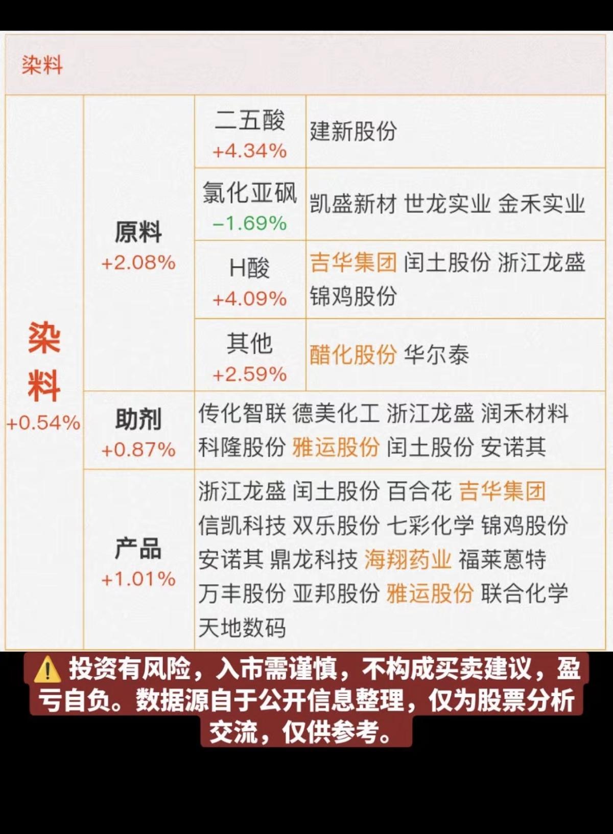 染料价格上涨! 闰土股份公告称,分散黑染料价格近期已累计上涨约9000月/吨。 1.原料 2.助剂 3.产品 相关核心龙头受益股:
