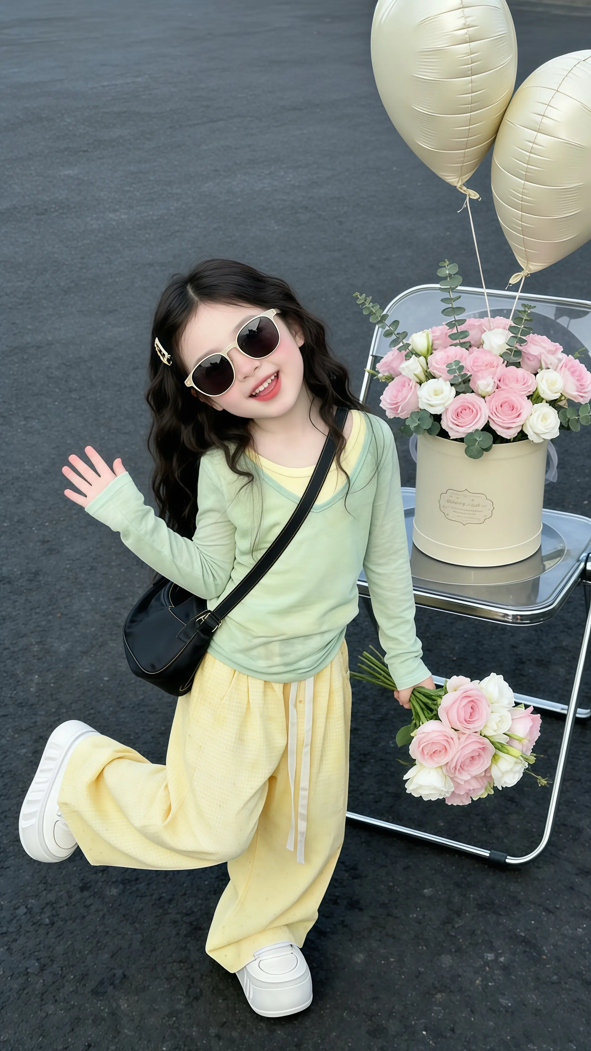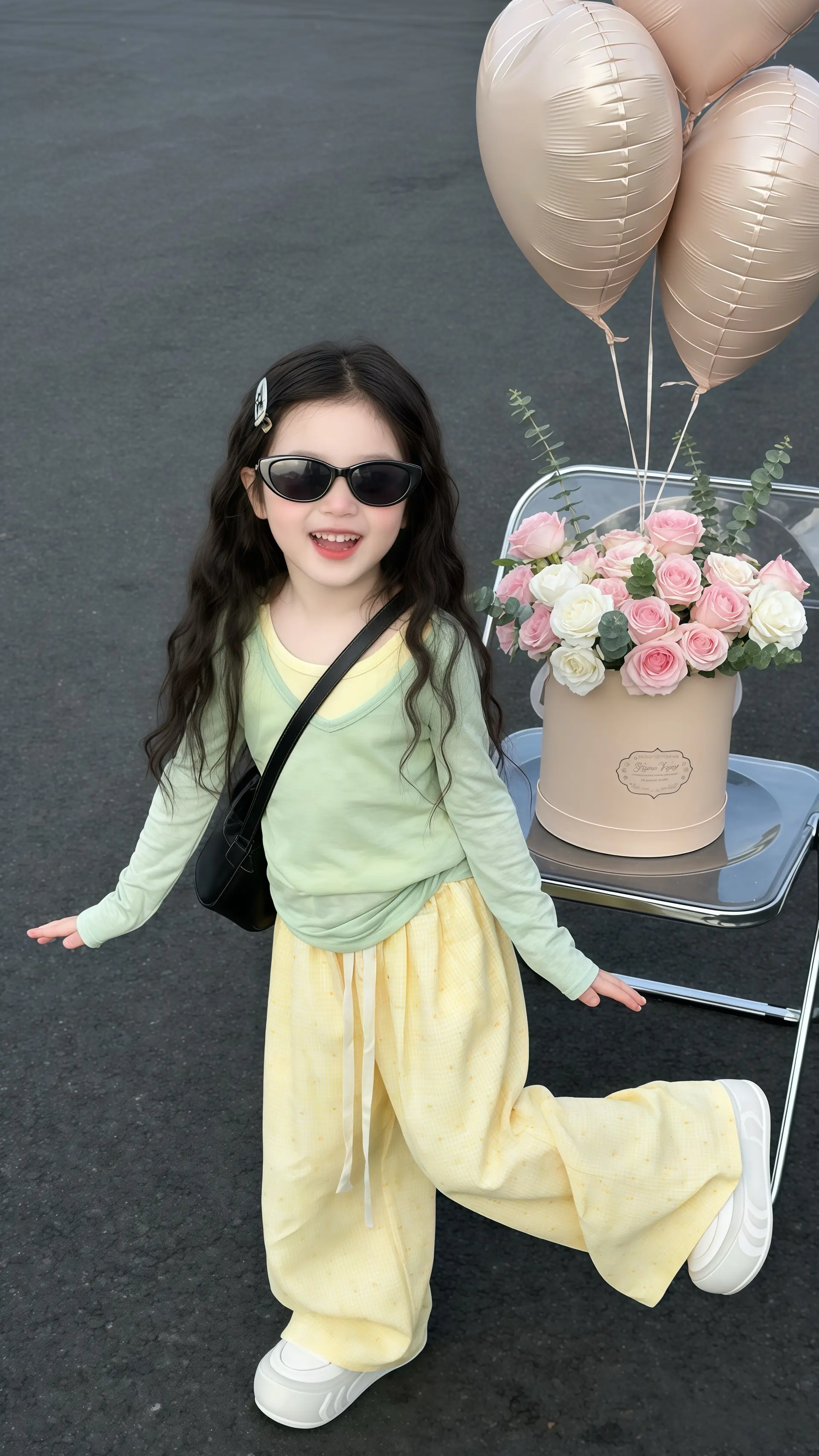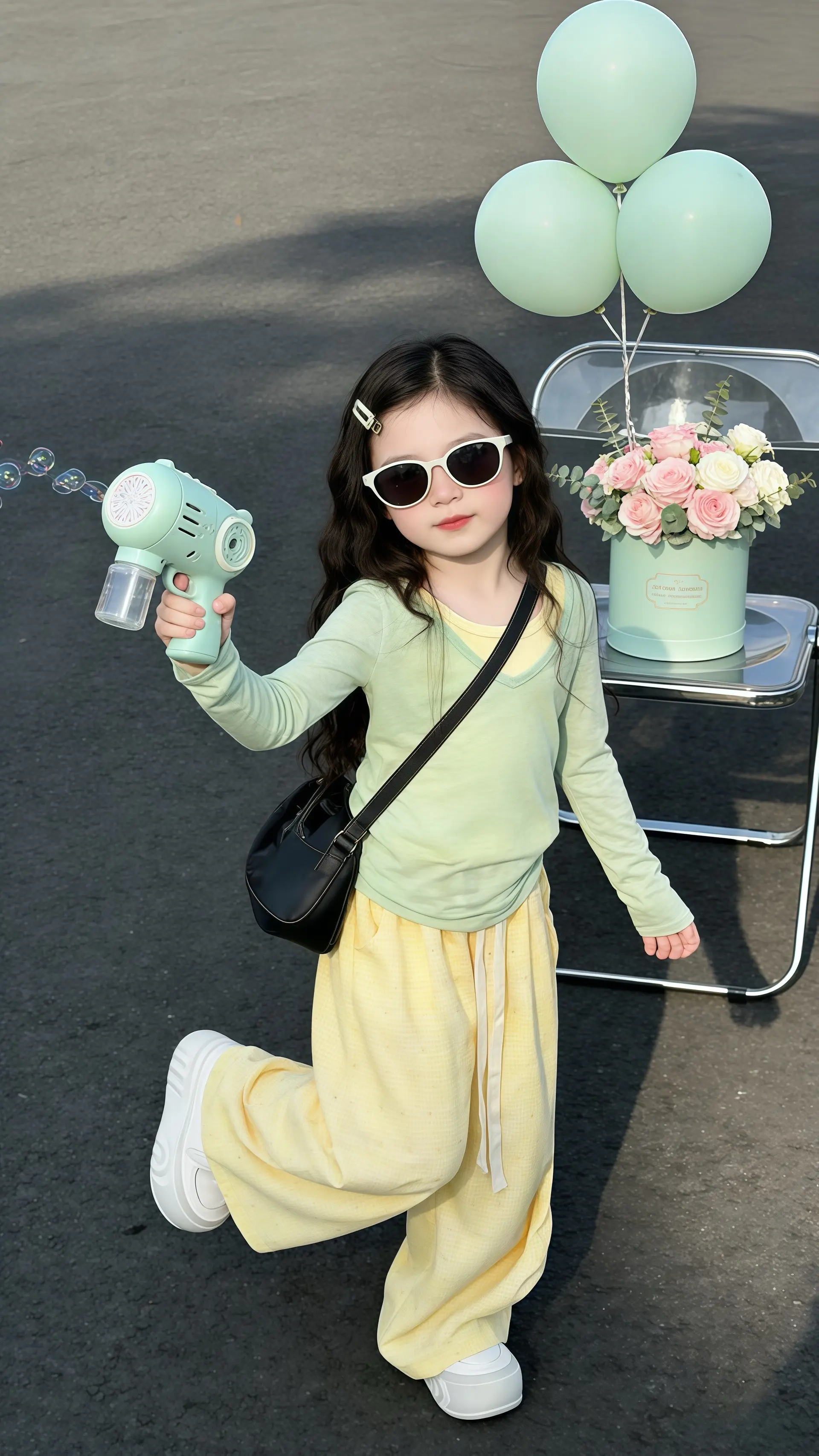 “妈妈你看这薄荷绿的相机和帽子,是不是把春天的清新都裹满啦?” “像!这黄裤子比小芒果还鲜亮” “我举着相机比‘抓’的劲儿,是不是把春风都勾来啦?” “快别晃啦,头发都飞成小瀑布咯~这春装裹满软乎乎的趣,连花桶里的小熊都想沾点喜。穿上像揣了快乐包的甜萌崽,出门连阳光都跟着柔,春天的甜从衣角暖到心里!这白鞋子一踩,连路过的风都想夸你俏呢~”