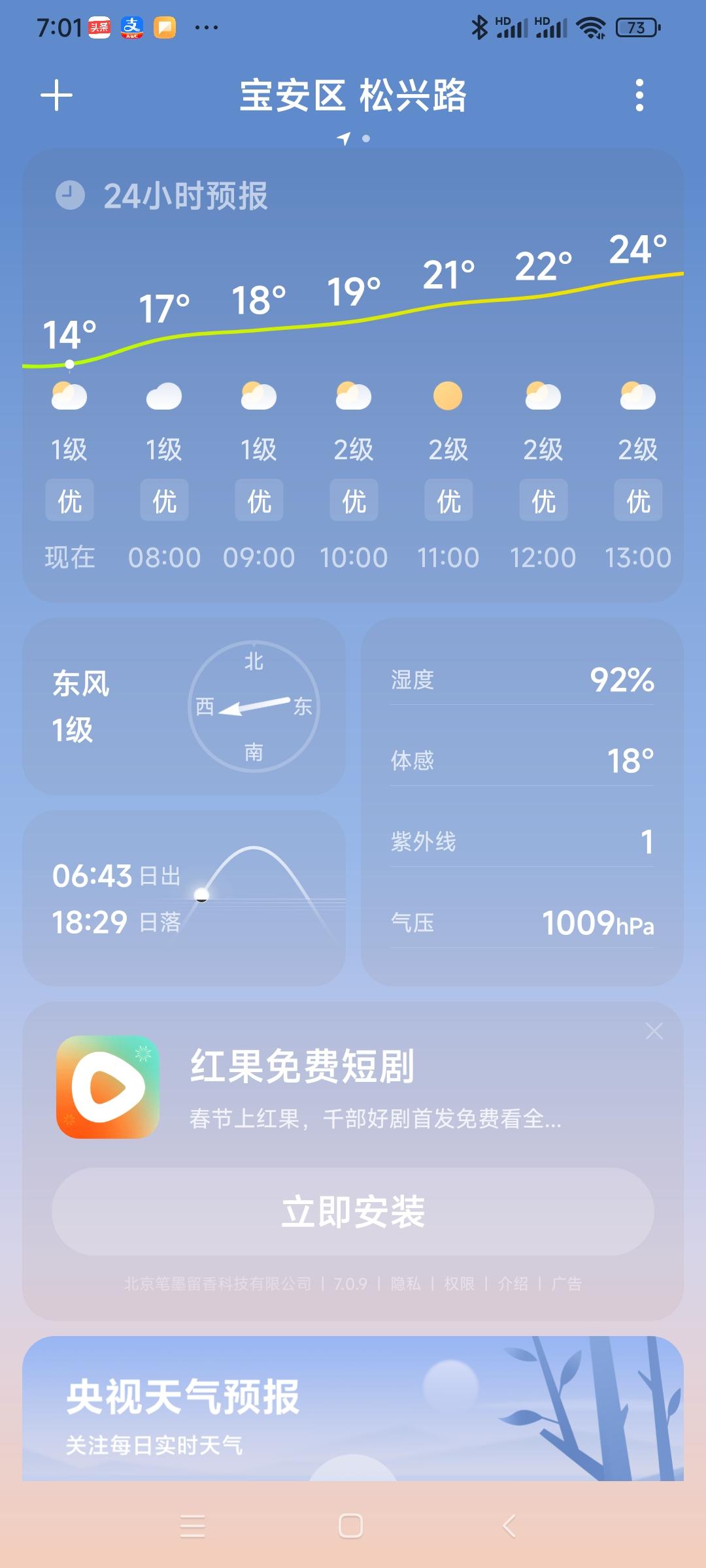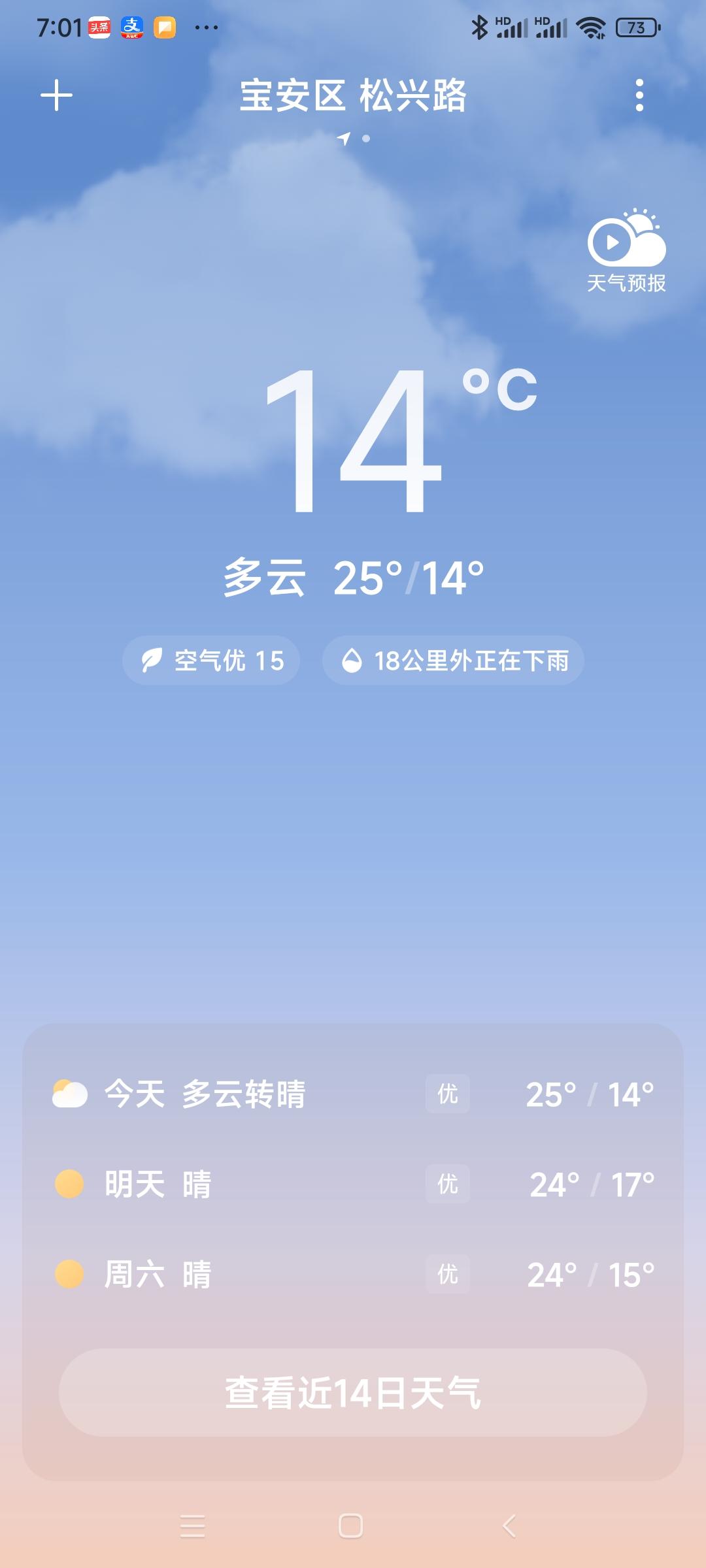 我的今日状态:😁轻松愉快 我这里的天气:🌤️多云深圳今日多云转晴,气温14度