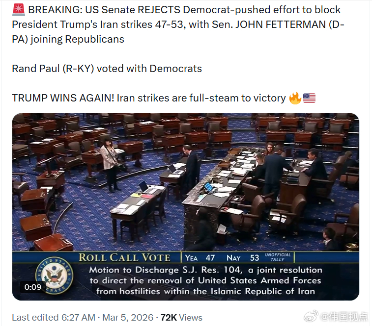 美国参议院否决了民左党推动的阻止特朗普总统对伊朗进行打击的努力,结果是47票对 53 票。