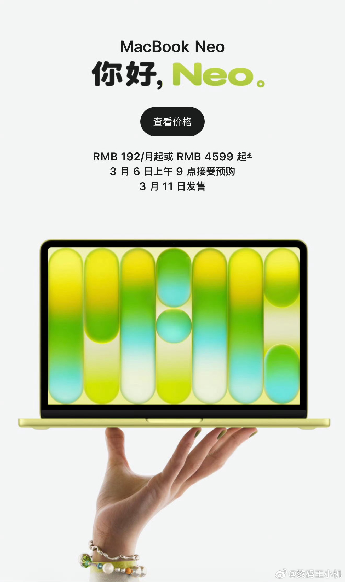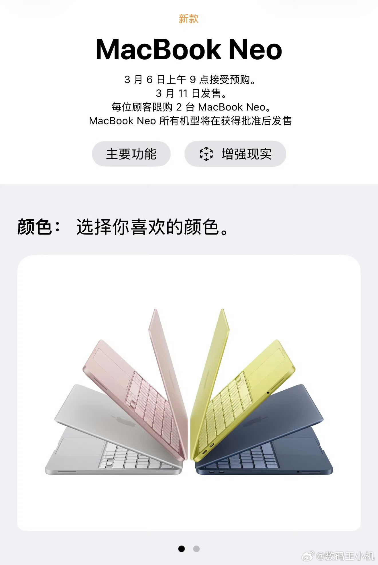 MacBookNeo未配备磁吸充电接口苹果正式发布MacBook家族入门款MacBook Neo,定位屏幕最小机型,采用全新外观与模具,有银蓝粉黄四种配色,全金属机身,配置上搭载13英寸Liquid视网膜屏,配备A18 Pro芯片、8GB内存,运行macOS 26系统,支持与iPhone互联。接口有双USB-C口、3.5mm耳机接口等,续航最长16小时,厚度1.27cm、重1.23kg。8 + 256版本无指纹识别,售价4599元起;8 + 512版本支持指纹识别,售价5299元起,教育优惠力度较大,你们准备选哪个颜色?