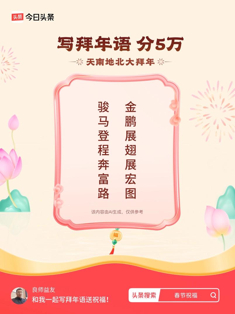 写拜年语送祝福新春拜年送祝福!我的祝福是:“骏马登程奔富路,金鹏展翅展宏图”!快来一起写祝福吧戳这里,一起领红包>