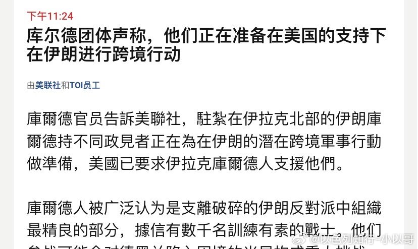 库尔德库尔德人都要地面战了,革命卫队导弹也快打没了,非法政权退出历史舞台的时间表越来越快,伊朗的未来已经注定要改写。面对现实吧,别吹革命卫队了。。。伊朗展开高强度连环反击海外新鲜事