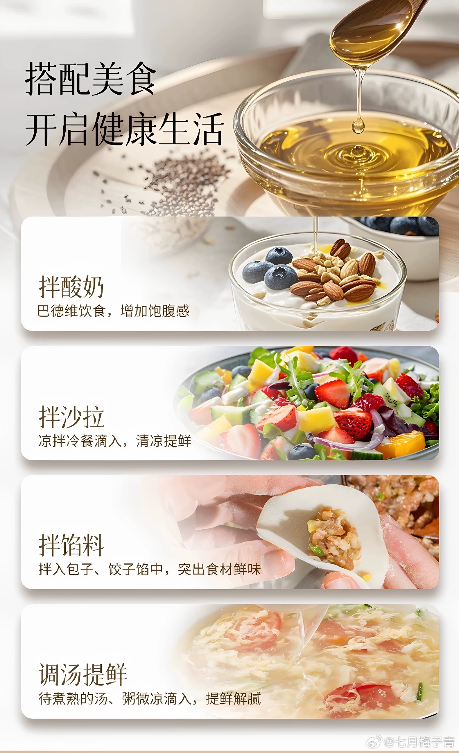 妈耶~这紫苏油也太香了吧~早上用它拌个凉菜,吃到嘴里感觉还没睡醒昏昏沉沉的脑子瞬间就醒过来了紫苏油的味道本身就很清爽清香,凉菜的食材一般头一晚就准备好放在冰箱冷藏里。这种搭配简直太赞了春季孩子长身体,也长脑子哦~吃法多种,全家一起补补脑七月梅子青