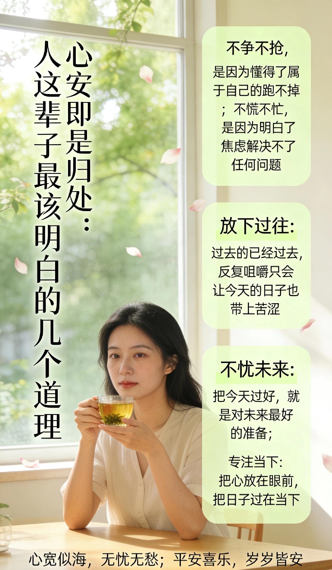 心安即是归处:人这辈子最该明白的几个道理 你有没有发现,随着年龄渐长,越来越喜欢这样一种生活状态—— 不争不抢,是因为懂得了属于自己的跑不掉;不慌不忙,是因为明白了焦虑解决不了任何问题。 把日子过成简单舒心的模样,原来才是最大的本事。 其实,真正的幸福从来不是拥有得多,而是懂得知足。这个道理说起来简单,能做到的人却不多。 那些真正活得通透的人,都学会了三个放下: 放下过往。过去的已经过去,反复咀嚼只会让今天的日子也带上苦涩。不是原谅,是算了;不是忘记,是不再让它影响现在的自己。 不忧未来。明天会发生什么,谁也不知道。把今天过好,就是对未来最好的准备。焦虑解决不了问题,行动才可以。 专注当下。此时此刻,这一顿饭,这一杯茶,这一句话,这一件小事——把心放在眼前,把日子过在当下。 真正厉害的人,不是能力有多强,而是心有多宽。 心宽了,路就顺了;心静了,福就来了。 愿你往后余生,心宽似海,无忧无愁;愿你的每一天,平安喜乐,岁岁皆安。 这才是人这辈子,最该明白的道理。 治愈系 人生感悟 心安即是归处