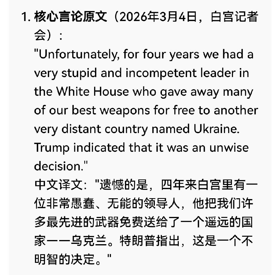 美军攻伊弹药告急,全怪拜登援乌没补库存 罗琳·莱维特3月4月在白宫记者会上说:“遗憾的是,四年来白宫里有一位非常愚蠢、无能的领导人,他把我们许多最先进的武器免费送给了一个遥远的国家乌克兰。特朗普指出,这是一个不明智的决定。”特朗普政府近期频繁将对伊军事行动的弹药紧缺问题,甩锅给拜登时期对乌军援。 据央视新闻3月4日消息,美军精确制导武器库存告急,部分弹药仅能维持数日高强度作战,白宫紧急召集军火商扩产。一边是战场弹药见底,一边是政客互相指责,看似矛盾,实则是美国地缘策略的必然结果。 当年拜登政府大力军援乌克兰,核心目标就是消耗俄罗斯,本就是美国两党共识下的战略布局。如今中东战事吃紧,军备短板暴露,便将自身战略选择的代价,全部推给前政府,不过是美式政治话术。 地缘博弈从无免费午餐,战略短视与内部甩锅,才是美军陷入军备困境的根源。