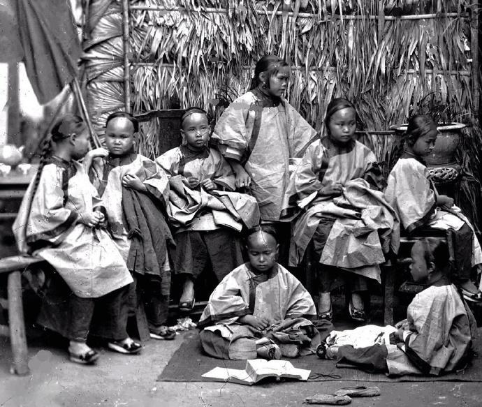 这张照片,由苏格兰摄影师约翰·汤姆逊于1868-1872年在福建厦门拍摄,是晚清闽南地区一群身着传统服饰的女童,她们聚集在一座简陋的茅草屋前,这很可能是当时闽南地区常见的女学场所。 女童们穿着统一的中式短袄和裤装,发型各异,有的留着长辫,有的则是孩童特有的发式。她们或坐或站,姿态各异,有的好奇地望向镜头,有的则低头专注于手中的书本或针线活。 在“女子无才便是德”的传统观念下,晚清女子教育极为匮乏,尤其是在民间。但在闽南等沿海地区,受西方传教士和开明士绅的影响,一些面向女童的私塾或教会女学开始出现。