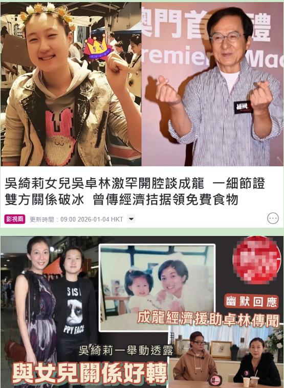 吴绮莉,公开回应! 3月4日,据媒体报道,吴绮莉近日在公开采访中,明确回应成龙私下资助女儿吴卓林的传闻,表示:这不是事实,这种资助根本就不存在,并透露父女没联系,也没相认。 港圈最拧巴的一段往事,又因为吴绮莉的一句回应,被重新扒了出来。 其实不用吴绮莉出面,稍微有点判断力的人都该想明白,所谓“私下资助”本就是站不住脚的传闻。 这些年,网上关于成龙给吴卓林铺路、设立信托基金、悄悄打生活费的说法,换着花样翻新,传得有鼻子有眼,仿佛爆料人亲眼所见。 可仔细琢磨就会发现,所有传闻都只有口头说法,没有任何实锤支撑,既没有转账记录,也没有知情人佐证,甚至连吴卓林本人都从未有过只言片语的确认。 作为父亲的成龙,自始至终都在刻意逃避,连一句关心、一次露面都吝啬给予。 如今,吴绮莉亲自出面印证,等于彻底打了那些辩解者的脸。 很多人同情吴卓林,不是因为她是“成龙的女儿”,而是因为她从出生起,就被这个标签绑架,成了这段失败关系的牺牲品。 二十多年的缺席,不是一句“关注海报”就能弥补的。 所谓的“关注”,更像是成龙为了维护自己“好男人”“好父亲”的人设,做的表面功夫,根本谈不上真心。 毕竟真要是在乎女儿,不会等到她长大成人、历经磨难后,才用这种敷衍的方式刷存在感。 网上还有一种说法,说当年成龙曾提出每月给9.7万元生活费,还准备给一套房子,条件是吴绮莉母女搬离香港,可双方没谈拢。 暂且不论这个说法的真假,就算是真的,这种带着附加条件的“资助”,也根本不是出于父爱,而是为了花钱买清净,想把这对母女彻底从自己的生活里抹去。 吴卓林年轻时叛逆,多次和母亲发生冲突,甚至两次报警抓母亲,还因为出了柜、辍学等事情和母亲决裂,一度离家出走。 很多人指责吴绮莉不会教育孩子,可没人想过,一个独自抚养女儿、被流言缠身、还曾深陷抑郁症的女人,能把女儿拉扯大,已经拼尽了全力。 这份历经磨难的母女情,比任何虚无缥缈的父爱都更珍贵。 吴绮莉这次的回应,之所以能引发这么大的讨论,本质上不是因为八卦,而是因为大家看透了这场闹剧背后的真相。 一个缺席的父亲,被舆论美化成“暗中关怀”,这从来都不是什么温情戏码,而是一场充满自私和逃避的悲剧。 有人说,都过去二十多年了,没必要再揪着不放。 可有些伤害,不是时间就能抹平的。 所谓的“各自安好”,从来都不是让受害者闭嘴,而是让缺席者正视自己的过错。 现在的吴绮莉,不抱怨、不纠缠,一门心思过好自己的日子,偶尔和朋友小聚,做自己喜欢的事情,气色越来越好,心态也越来越平和。 而吴卓林,也在加拿大慢慢找回自己的生活,专注于自己的设计工作,努力屏蔽外界的声音。 她或许永远都无法原谅父亲的缺席,但至少,她还有母亲的陪伴,还有自己的人生可以把握。 对于这件事,您有什么想说的吗?欢迎评论区留言讨论。