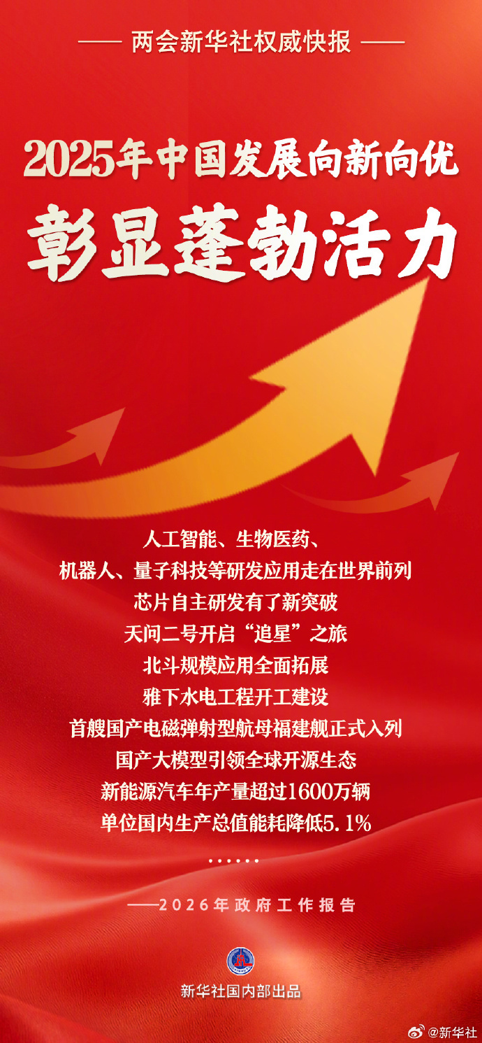 #我国发展向新向优彰显蓬勃活力##人工智能等研发应用走在世界前列#两会新华社快讯:政府工作报告说,一年来,我国发展向新向优、彰显蓬勃活力。新质生产力稳步发展,科技创新成果丰硕,人工智能、生物医药、机器人、量子科技等研发应用走在世界前列,芯片自主研发有了新突破,天问二号开启“追星”之旅,北斗规模应用全面拓展,雅下水电工程开工建设,首艘国产电磁弹射型航母福建舰正式入列,国产大模型引领全球开源生态。产业结构持续优化,高技术制造业、装备制造业增加值分别增长9.4%、9.2%,工业机器人、集成电路产量分别增长28%、10.9%,新能源汽车年产量超过1600万辆,电动汽车充电设施突破2000万个。单位国内生产总值能耗降低5.1%,生态环境质量持续改善。#观看两会#