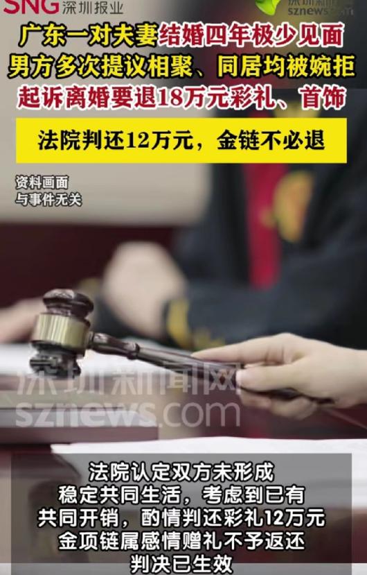 这算哪门子夫妻?广东韶关,男女闪婚后,因为工作原因开始两地分居,极少见面,男子非常想念妻子,多次提出周末去找她,两人好好温存一番,但屡次遭到妻子拒绝,结婚四年,两人连一次夫妻生活都没有,这算什么两口子,男子逐渐对这段名存实亡的感情彻底绝望,到法院起诉离婚,并要求妻子全额返还18万彩礼和一条金项链,法院这样判。   广东韶关一对男女经媒人介绍认识后,没怎么了解就仓促办了结婚登记,还办了婚礼。   本来以为是开启新生活,没想到婚后因为工作原因,俩人直接开始了两地分居,见面的次数屈指可数。   男方心里一直记挂着妻子,特别想念的时候,就多次提出周末过去找她,好好聚聚培养感情,可不管他怎么说,都被妻子一次次拒绝了。   说出来可能有人不信,这对夫妻结婚整整四年,居然连一次夫妻生活都没有,这哪儿像两口子啊,分明就是最熟悉的陌生人。   男方一开始还抱着希望,觉得慢慢沟通总能改善,可日复一日的拒绝,让他慢慢心凉,到最后对这段名存实亡的感情彻底绝望,只能拿着相关材料,到法院起诉离婚,还要求妻子全额返还当初给的18万彩礼和一条金项链。   其实说到两地分居,咱们都知道,像北京这样的大城市里也有不少这样的情况。   可韶关这对夫妻不一样,他们的分居不是没办法的选择,更像是一种刻意的疏远,男方主动迈出的每一步,都被女方挡了回来。   说白了,婚姻的本质就是两个人互相陪伴、共同生活,哪怕是异地,也得有基本的情感交流和相处,可他们四年里几乎没有真正意义上的夫妻相处,这段婚姻从一开始就失去了该有的样子。   法院审理之后,也给出了判决,没有支持男方全额返还彩礼的要求,而是酌情判定女方返还12万,至于那条金项链,因为是男方婚前为了增进感情赠予女方的,不算彩礼范畴,所以不支持返还。   这个判决其实挺合理的,俩人虽然没真正共同生活,但毕竟办了结婚登记,也有一些共同的开销,扣减一部分也说得通。   这事儿也给咱们提个醒,结婚真的不能太草率,闪婚看似省事,可一旦没有感情基础,再加上长期分居和缺乏沟通,最后只会走向破裂。   不管是在韶关这样的城市,还是在北京这样的大城市,夫妻之间最重要的就是互相理解和陪伴,哪怕距离再远,也得用心维护,不然再高的彩礼、再隆重的婚礼,也撑不起一段没有温度的婚姻,到最后闹得人财两空,得不偿失。
