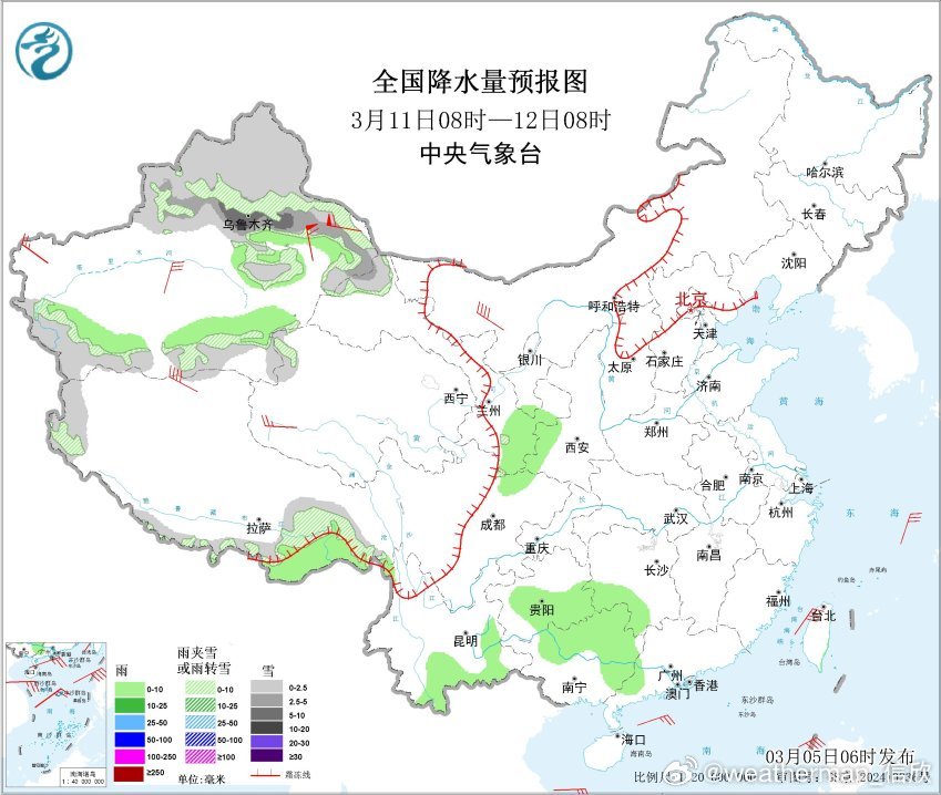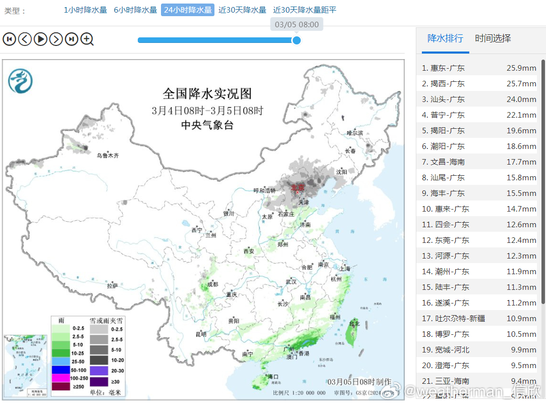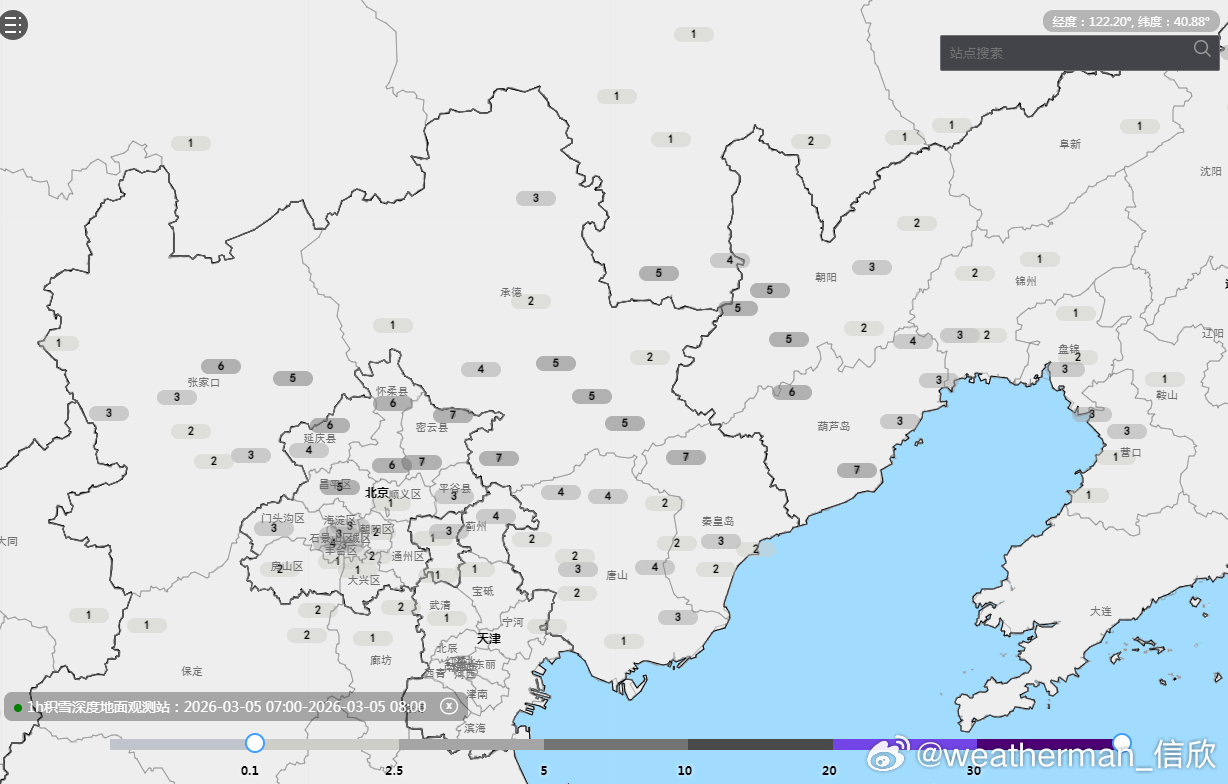 【降水】昨天到今晨,南方降雨主要在华南,广东东部出现中到大雨。新疆西部山区、华北多地以及辽宁西部等地出现降雪。新疆吐尔尕特出现暴雪,北京北部、河北北部、辽宁西部一带出现大雪。今晨8时积雪,河北青龙、辽宁绥中、北京密云和上甸子都是7厘米,为各自省市积雪最深站点。