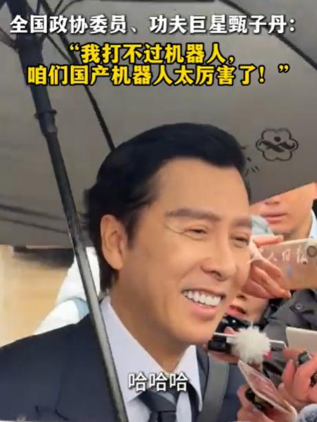 同样是它,甄子丹这次很低调。 之前,说到打它,甄子丹上来就是打十个。 这一次,面对机器人,甄子丹各种夸,被问到如果交手会怎样,甄子丹直言它太厉害了,可能打不过。 那么,我想到一个有趣的数学题,如果可以打它10个,然后和五个机器人打个平手,那么五个机器人可以打它10个,而且机器人还在不断进步,如果有一天,它和它打了起来,真为它捏把汗啊。 虽然是开个玩笑,但是我是认真的。