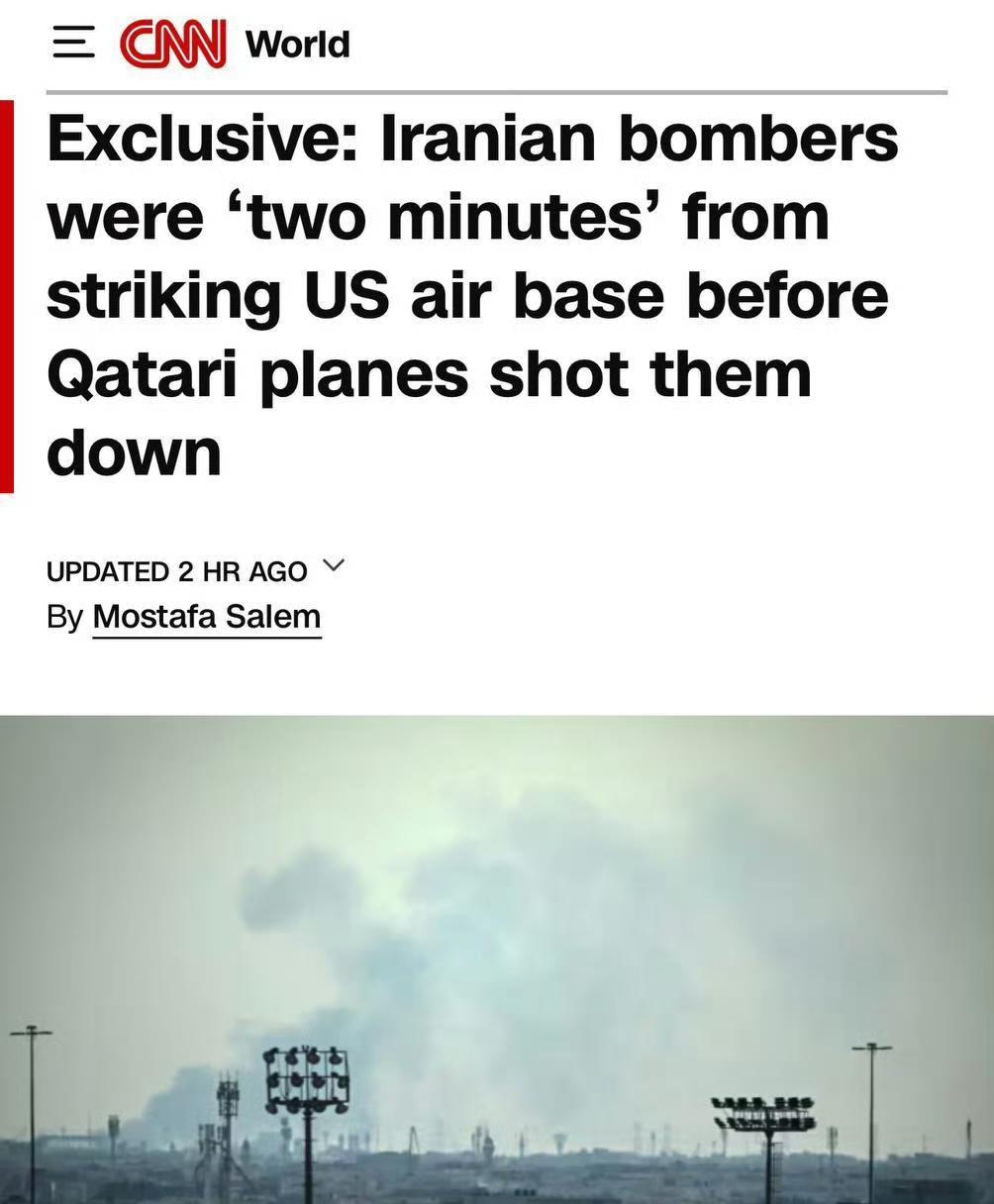 昨天的事情,现在内幕被报道。飞行员真勇敢,明知道有可能有去无回。 伊朗史无前例地派遣两架全副武装的苏联时期苏-24战斗机,以80英尺的超低空飞行高度袭击海湾合作委员会成员国,试图躲避雷达侦测,突袭位于卡塔尔的阿尔乌代德空军基地。该基地驻扎着1万名美军士兵。 随后,卡塔尔的F-15战斗机与其展开空战,并在卡塔尔领海上将其击落。 据知情人士向CNN透露,这些伊朗战机距离目标仅剩"两分钟"飞行时间,且被目击到携带炸弹和制导弹药。