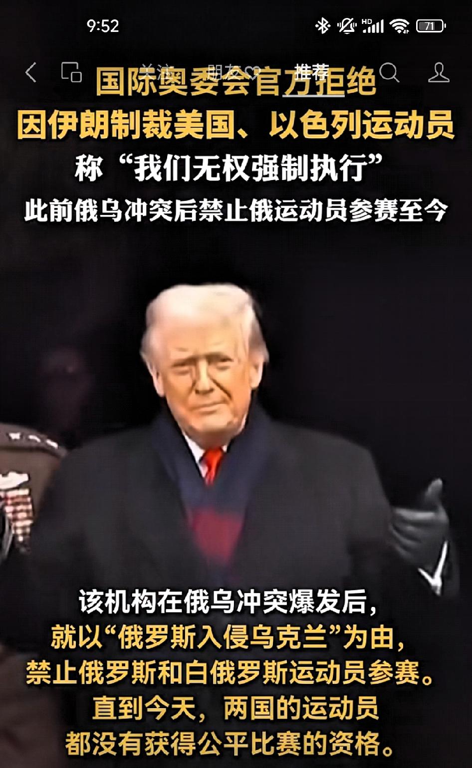 国际奥委会拒绝因为“入侵伊朗”而制裁美国和以色列!此前俄乌冲突后拒绝俄罗斯运动员