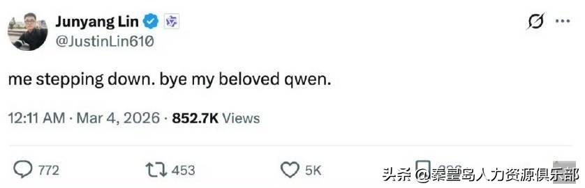 阿里Qwen的“灵魂人物”走了!32岁的林俊旸,阿里最年轻的P10,半夜突然发推说“再见,我亲爱的千问”,整个AI圈都炸了。 这哥们儿可是个传奇。93年的,北大计算机本科,语言学硕士,标准的学霸。2019年一毕业就进了阿里达摩院,从高级算法工程师干起,参与了M6、OFA这些大项目。2022年底,阿里把AI团队整合成通义实验室,他就成了通义千问的技术负责人,带着团队一路狂奔。 他最牛的是啥?是带着Qwen从无到有,硬是在全球大模型排行榜上跟GPT、Claude这些巨头掰手腕。2024年主导开源,2025年推出旗舰模型Qwen3-Max,参数过万亿,直接冲进全球前三。去年5月,32岁就升到了P10,阿里技术线的顶级专家,史上最年轻。就在前几天,他刚带队发布了让马斯克都点赞的Qwen3.5小模型。 结果呢?模型发布没两天,人就走了。更扎心的是,团队核心成员也跟着一起撤了,后训练负责人、代码负责人,好几个骨干都走了。有同事直接说:“离开不是你的选择。” 这味道,打工人都懂。 为啥走?有说法是阿里要把Qwen团队打散重组,从垂直整合变成水平分工,这跟林俊旸坚持的“预训练、后训练、Infra应该紧密协同”的理念冲突了。说白了,可能就是理想碰到了现实的墙。技术人想的是把模型做到极致,但公司到了一定阶段,想的可能是怎么商业化、怎么管理、怎么控制成本。 一个亲手把“孩子”养大的人,在品牌统一、眼看要更上一层楼的时候突然离开,心里得多不是滋味。这不禁让人想问,大厂里,到底是KPI和报表重要,还是那些能带着团队冲锋、眼里有光的技术理想重要?林俊旸的离开,或许只是一个缩影。但对我们打工人来说,看到这样的顶尖人才转身,心里除了唏嘘,更多的是一种兔死狐悲的凉意。