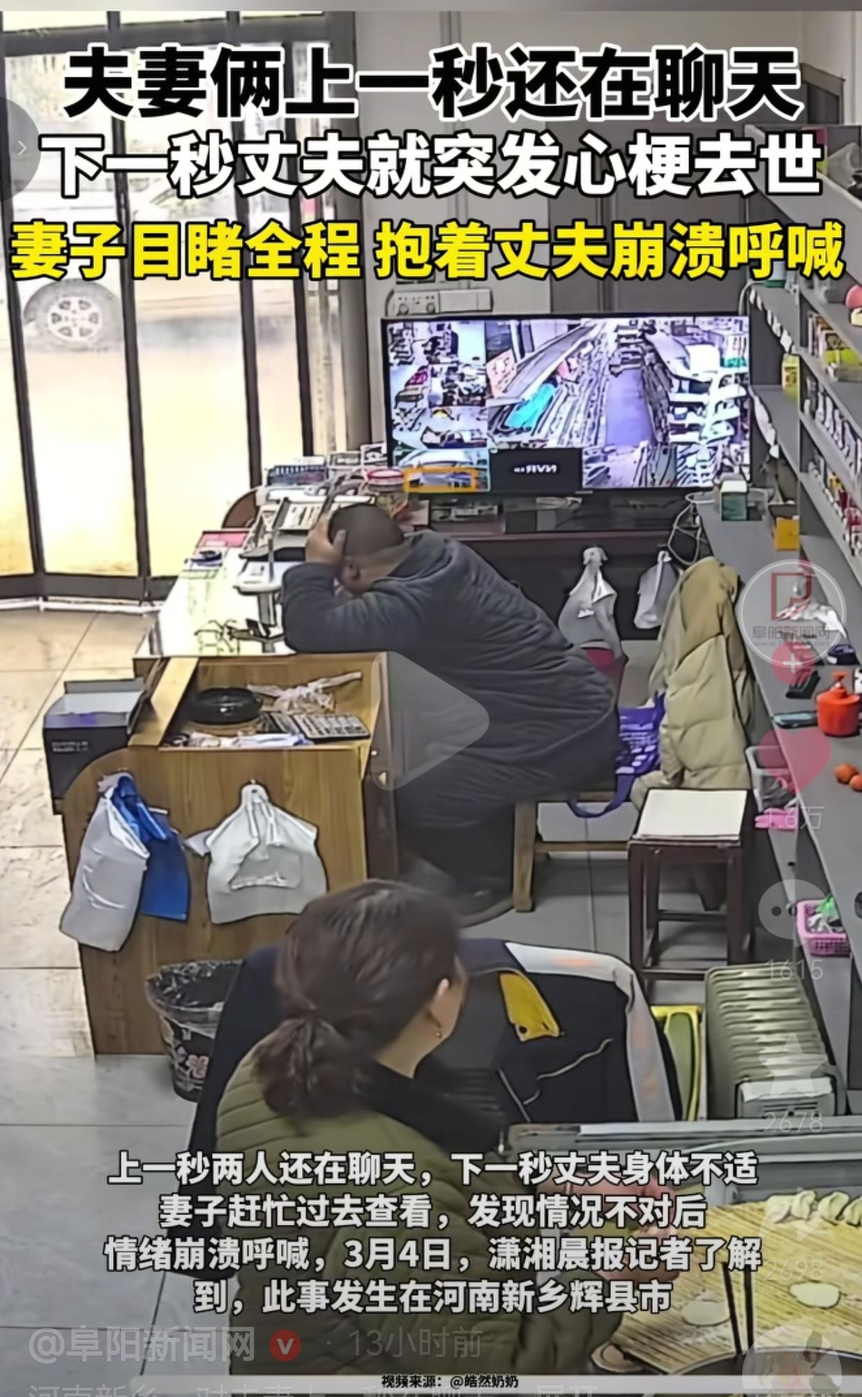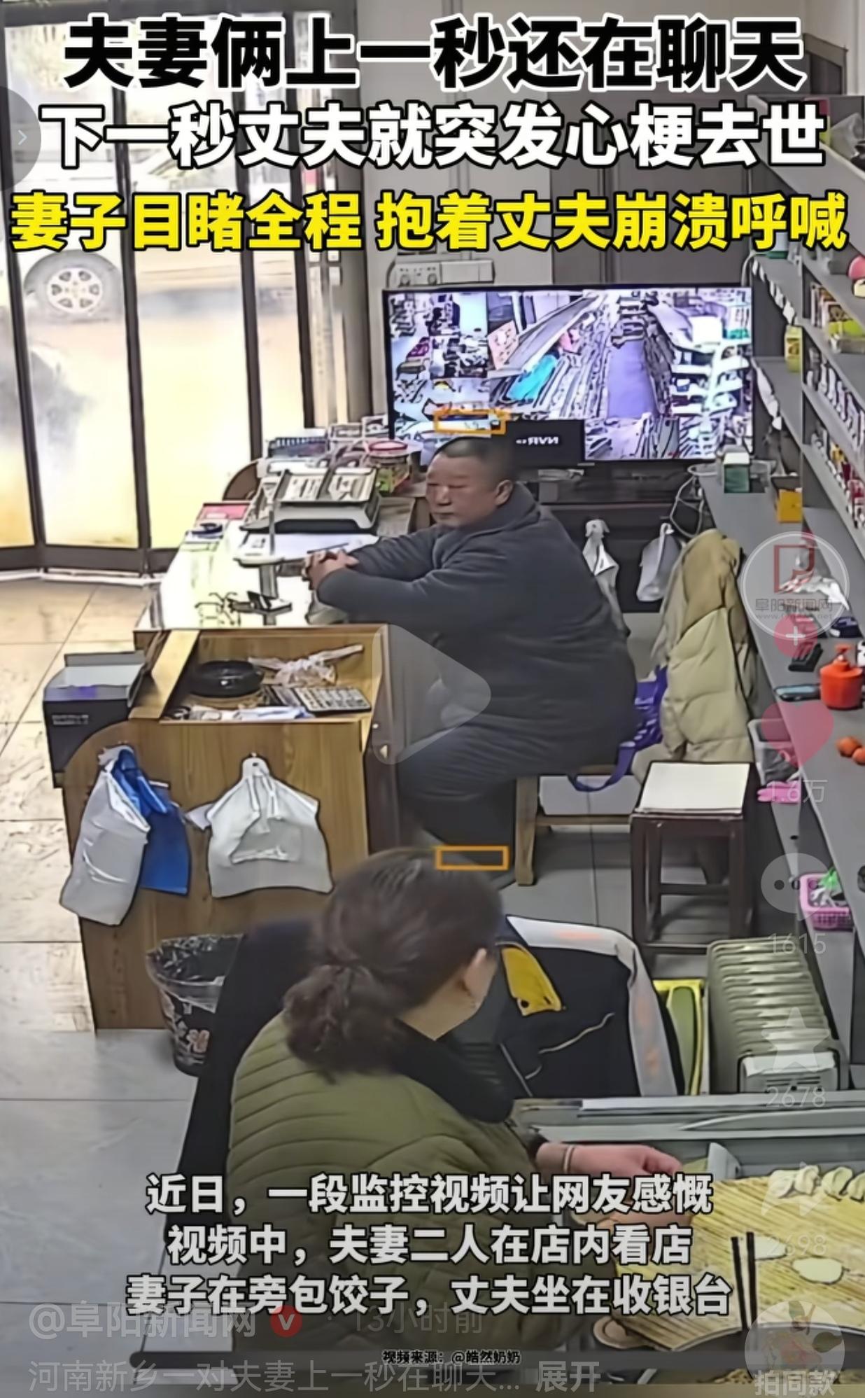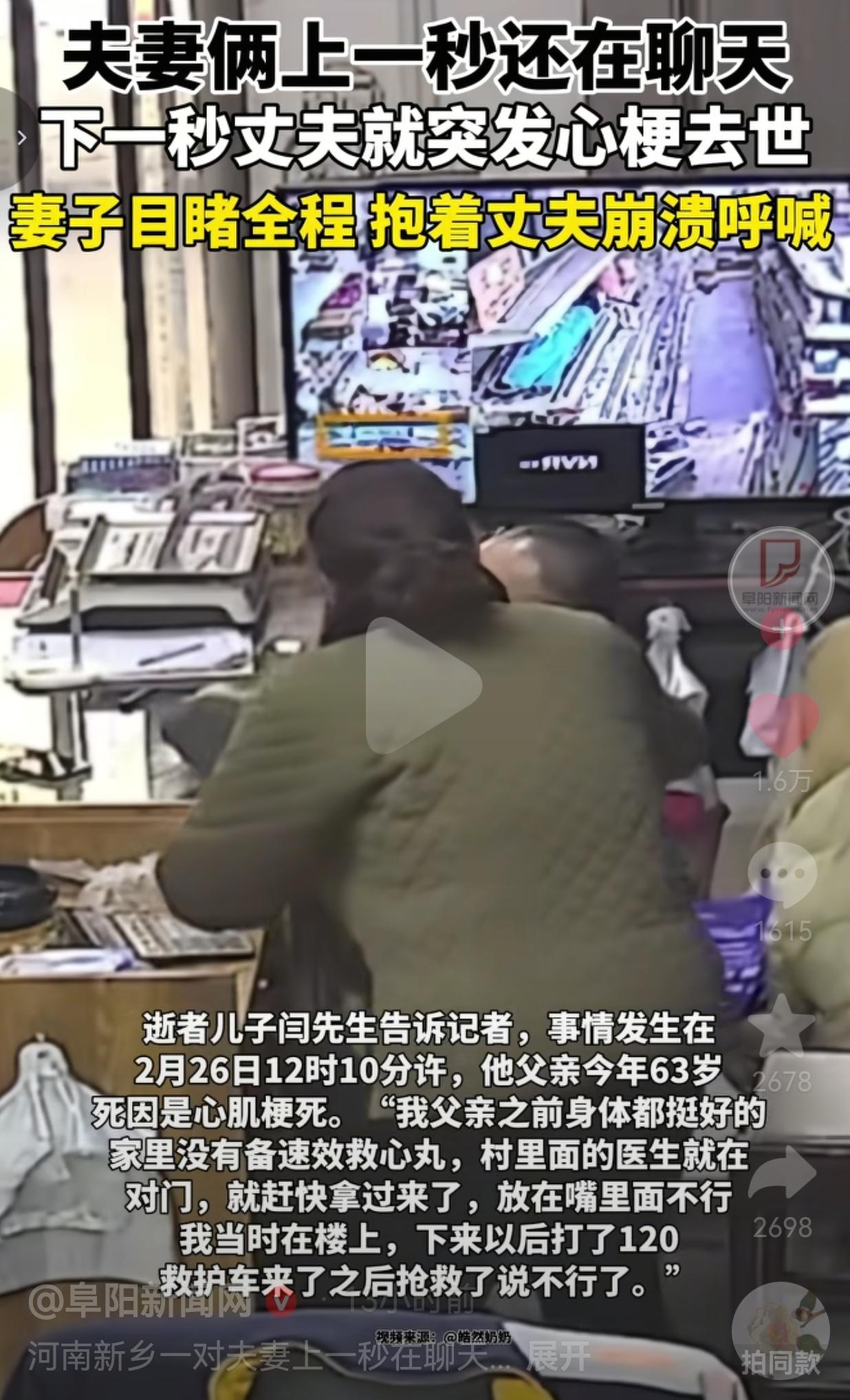 生命有时候真的很脆弱!63岁丈夫前一秒还在店里聊天,下一秒突发心梗离世,妻子抱着他崩溃:有些告别,真的来不及说再见!!! 2月26日中午12点10分,河南新乡辉县的一家小店里,一切都像往常一样,一切都好像变了! 63岁的老闫坐在收银台,和正在包饺子的妻子有一搭没一搭地聊着天。 阳光透过玻璃门照进来,案板上的饺子皮还带着温度,谁也没想到,这竟是夫妻俩最后一次对话。 下一秒,老闫突然捂住头,身体不受控制地往下滑。妻子手里的擀面杖“啪”地掉在地上,她冲过去抱住丈夫,撕心裂肺地呼喊,可那个前一秒还在和她说话的人,再也没有回应。 儿子闫先生说,父亲平时身体挺好,家里没备速效救心丸,对门村医拿来药也没用,等120赶到,一切都晚了。 网友看到后评论说:“家里有老人的,速效救心丸真不能省!我妈上次胸闷,就是靠这个撑到医院的,救命的东西,别嫌麻烦。” 也有的网友说:“最痛的不是生离死别,是你还在计划着未来,他却已经计划着离开。愿天堂没有病痛,也愿我们都能珍惜眼前人。” 还有的网友说:“别再透支身体了,钱赚不完,命只有一条。少熬一次夜,少喝一顿酒,多陪家人吃顿饭,比什么都强。” 我们总以为来日方长,总觉得“等有空了,等下次”,可命运哪管你有没有准备好?它就像个不打招呼的访客,说来就来,把你以为的“以后”,硬生生变成了“再也没有”。 心梗不是老年人的专利,它越来越年轻化,也越来越猝不及防。很多人觉得自己“身体倍儿棒”,可那些藏在血管里的斑块、那些被忽视的胸闷、心慌、左肩酸痛,都是身体在拉响警报。 我们总在忙,忙着赚钱,忙着应酬,忙着“为了这个家”,却忘了最该守护的,是身边那个和你一起守着小店、一起包饺子的人。 别等失去了,才想起没好好说一句“我爱你”;别等来不及了,才后悔没多陪他吃一顿热饭。 生命的脆弱,从来都比我们想象的更猝不及防。 针对此事,你有什么看法呢?欢迎大家评论区讨论留言。
