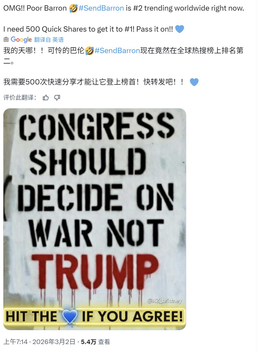 “请特朗普派19岁的儿子巴伦与美军一起对抗伊朗吧!” 美国网友呼吁特朗普派他的儿子巴伦前往伊朗战场,一度冲上全球热搜榜第二。 没人想到,一个19岁少年,会因为一场战争,被推到全球舆论的风暴眼。 这场热搜的核心,从来不是巴伦本人,而是藏在背后的特权与公平、战争与责任的尖锐对立。 为这场战争买单的,从来不是特朗普这样的权贵阶层,而是普通家庭的孩子。 那些奔赴战场的士兵,大多来自中低收入家庭,他们没有特权可享,没有后台可依,只能被派到战火纷飞的伊朗,用生命换一份微薄的薪水,用血肉之躯替权贵的决策买单。 而特朗普的儿子巴伦,却能在安全的环境里享受生活,甚至靠着家族光环涉足政坛,这种鲜明的对比,不炸锅才怪。 你特朗普要发动战争,要让别人的孩子去送死,那你自己的孩子,凭什么能例外? 网友发起这个话题,不是恶意刁难,而是想戳破特朗普的虚伪。 嘴上喊着“为国家而战”,让普通家庭奉献牺牲,自己却把儿子护得严严实实。 这种双重标准,谁能接受? 有人说“巴伦没军事经验,去战场就是送死”,这话听起来好像有道理,可那些奔赴伊朗的普通士兵,难道一开始就有军事经验? 还有人说“巴伦比较低调,不该被牵连”,可低调从来不是特权的遮羞布。 既然享受了家族带来的名利和特权,就该承担相应的责任,不能好事全占,风险全推。 更可笑的是,那些为巴伦辩解的人,大多是特朗普的支持者,他们一边拥护特朗普发动战争,一边又反对巴伦参战,本质上就是双标到极致。 他们接受普通家庭的孩子牺牲,却容不得权贵的孩子受一点委屈,这种心态,恰恰是美国社会特权固化的真实写照。 不管是哪个国家,人们都厌恶双重标准,厌恶权贵阶层搞特殊化,厌恶有人用别人的生命换取自己的利益。 放眼美国历史,这种“权贵避战”的争议从来就没断过。 更值得注意的是,这场热搜不仅暴露了美国的内部矛盾,也让美国的国际形象再次受损。 截至目前,特朗普和巴伦本人,都对这个热搜避而不谈,既不回应,也不表态。 其实大家都清楚,巴伦最终大概率不会去伊朗战场,特朗普不可能把自己的儿子推向危险境地,这场热搜,最终可能只是一场无意义的舆论狂欢。 战争从来不是儿戏,每一个生命都值得被尊重,每一份牺牲都不该被轻视。 特权可以带来一时的安逸,却永远换不来真正的尊重,而任何脱离公平正义的决策,最终都会被民众抛弃。 对于这件事,您有什么想说的吗?欢迎评论区留言讨论。