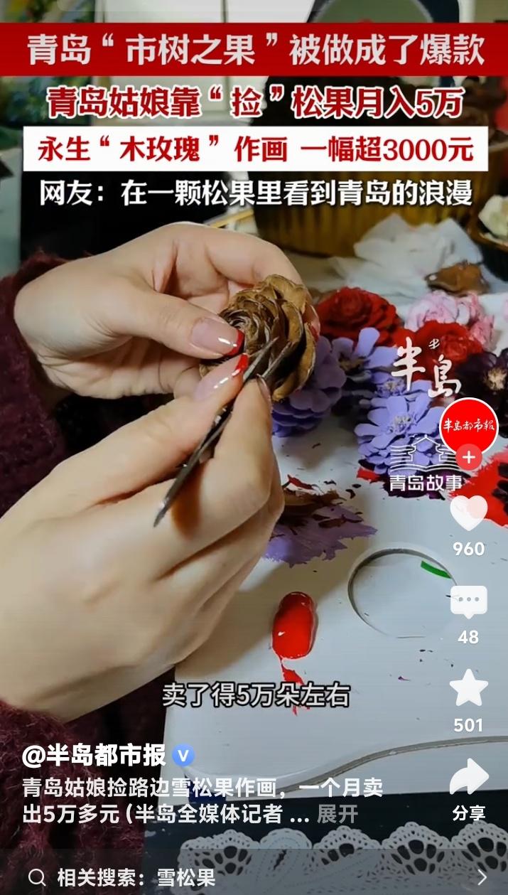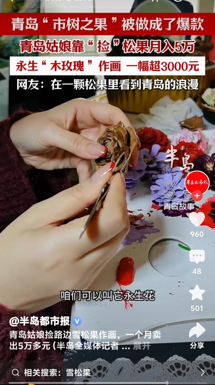 青岛姑娘路边捡“市树之果”做成永生花,一幅画卖3000元月入5万,网友:一颗松果装下了整座青岛的浪漫! (来源:半岛都市报、短视频平台网友热议) 谁能想到,路边无人问津的雪松果,竟被一位青岛姑娘点石成金。她捡起这些“木玫瑰”,稍加创作便成了网络爆款,单月收入突破五万元。这不仅仅是手工的成功,更是一场关于情感价值与商业智慧的生动演绎。 松果遇水闭合,干燥绽放,仿佛拥有生命。这种自然的神奇被姜小能捕捉,转化为艺术灵感。她将松果组合成画,赋予“永不凋谢”的寓意。当作品出现在短视频平台,瞬间击中了都市人渴望永恒浪漫的柔软内心。 订单如雪片般飞来,她却用一元单颗的松果引流,用高达三千元的定制画作盈利。这种策略巧妙至极,低价吸引广泛关注,高价满足深度情感需求。网友甚至用特产交换,自发传播让她省去了大量营销成本。 雪松是青岛的市树,三十年母树方能结果,稀缺性自带故事。她把地域文化融入产品,让一颗松果承载了城市印记。网友感叹:“在一颗松果里看到了青岛的浪漫。”这已不再是简单手工,而是情感IP的胜利。 翻看评论区,满是回忆与共鸣。有人想起童年捡松果烧火的岁月,有人惊讶于其生命般的开合。也有人疑惑,为何同样的东西在别处无人问津?这恰恰印证了产品的核心不是物品本身,而是它被赋予的意义。 姜小能面临的甜蜜烦恼是产能不足。她计划开设工作室,将这份浪漫事业规模化。她的故事告诉我们,小生意赚大钱的关键,在于能否用低成本资源,搭建出层次丰富的情感产品矩阵。 在这个追求速朽的时代,人们反而更愿意为“永恒”付费。一朵不会凋谢的“木玫瑰”,一幅可存放一生的画,慰藉的是我们对持久美好的向往。姜小能的手指,点亮的不仅是松果,还有无数人心中那盏关于浪漫的灯。 她的成功无法简单复制,但背后的逻辑值得深思。真正的商机往往藏于被忽视的日常,真正的价值永远建立在与人心共鸣的深度之上。下一次,当你路过一棵树、看到一片落叶,或许,改变生活的灵感就在其中。 情感经济 手作创业