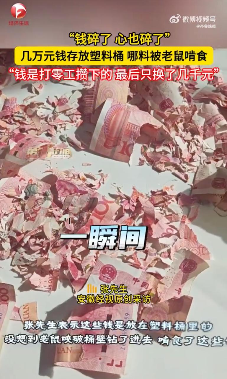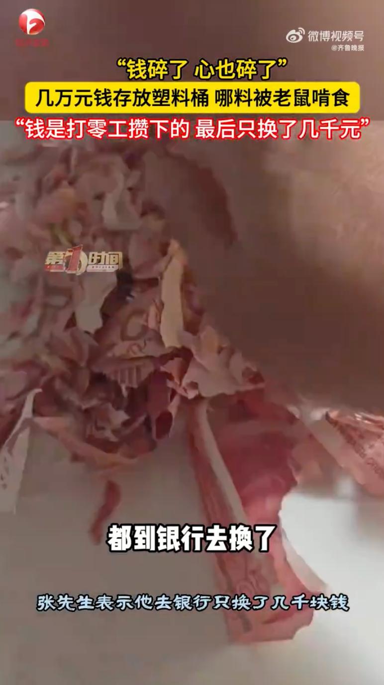 天塌了!云南昭通,一男子家住深山,好不容易攒下几万块塞进塑料桶里,没成想竟被老鼠啃成了碎渣,几万块最后只兑回来几千块,网友:为什么不放银行? 3月4日,张先生把塑料桶拽出来,本想看看攒了多少钱,结果掀开盖子心都凉透了,原本红通通的一叠叠百元大钞,现在全变成了密密麻麻的红纸屑,厚实的塑料桶壁硬是被老鼠咬开一个大缺口,满桶的钞票被啃得稀碎,边缘全是细细密密的锯齿状齿痕,有些碎片甚至只有指甲盖那么大,连防伪标识都认不出来了。 张先生家住大山深处,平时进出不方便,总想着把钱攒够一定数额再跑趟银行,谁料这塑料桶根本挡不住大山里的老鼠。 这几万块钱被老鼠当成了磨牙棒和筑巢的边角料,张先生看着满地残骸,心疼得直掉眼泪,说自己现在整宿整宿睡不着觉,一闭眼就是那些碎纸。 他连夜把这些“红纸片”搂起来送去银行,工作人员一点点拼凑鉴定,按照面积剩下大半个才能换半额的标准,这几万块最后只缩水换回了几千块,绝大部分碎片因为面积太小,只能作废,几年的苦日子算是白熬了。 评论区里网友也是干着急,有人纳闷为啥不早点存银行,多少还能挣点利息 也有人担心财不露白,万一招了贼也是血本无归,看着这一地的红色纸屑,真是隔着屏幕都能感受到那种绝望。 其实大山里的老百姓也有苦衷,离镇上远,对银行流程不熟悉,总觉得钱在手里“看得见摸得着”才最踏实 尤其是老人家,习惯了把积蓄往粮缸、空心砖或者塑料桶里塞,谁知这老鼠是真不客气,塑料桶和纸箱子在它们牙跟前就跟纸糊的一样。 要是家里真有现钱想临时存放,千万别用塑料桶,得找铁盒子、金属罐这种硬家伙,还得分散开搁,屋里粘鼠板、毒饵站也得备上 其实最好还是存银行,留在家里搞不好就成了老鼠的“磨牙棒”。 对此,你怎么看?