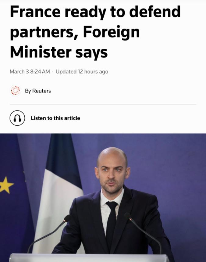 法国人终于出手了!路透社3月3日援引法国外长让-诺埃尔·巴罗的表态称,法国已动用部署在海湾地区的阵风战机执行空域安全和防空巡逻任务,以保护法国在当地的军事基地和利益。 法国在海湾可不是临时搭了个棚子,早就在这里扎下了稳固的军事根基。以阿联酋为核心,它设有三大支柱基地,阿布扎比的萨拉姆海军基地能停靠除戴高乐号航母外的几乎所有舰艇,阿尔达夫拉空军基地常年部署着6架阵风战机,扎耶德军事城还有主战坦克和自行火炮坐镇,常驻军人加起来超过一千人。 这些基地不只是摆样子的据点,更是法国辐射中东、掌控关键水道的战略支点,扼守着红海入口和波斯湾通道,是连接地中海与印度洋的关键节点。 而3月初的局势让这些据点直接暴露在风险中,伊朗的报复性袭击波及整个海湾,2月28日起,阿联酋、科威特、巴林等国连续遭到导弹和无人机轰炸,法国驻阿布扎比的海军基地机库也被无人机击中,虽然损失不大,但这是对其海外存在的直接挑衅,动用阵风战机执行防空巡逻,首先就是要守住自己的一亩三分地,不让军事支点出问题。 真正让法国无法坐视不理的,是海湾地区牵动其国计民生的能源命脉。霍尔木兹海峡承担着全球20%的石油和液化天然气运输,而欧洲在俄乌冲突后早已高度依赖中东能源,卡塔尔一家就占了欧洲LNG进口的30%以上。 法国自身25%的原油依赖中东进口,10%的石油供应要经过霍尔木兹海峡,境内能源巨头道达尔还在伊拉克推进着270亿美元的综合能源项目。当伊朗宣布关闭霍尔木兹海峡,十多艘油轮被击中,国际油价单日暴涨13%,法国的经济神经瞬间绷紧。 一旦这条通道长期封锁,欧洲天然气价格可能飙升130%,法国制造业会因为能源成本暴涨面临产能外移,普通民众的取暖和用电成本也会翻倍。阵风战机的巡逻航线,其实就是在为这条能源生命线护航,通过军事存在形成威慑,防止冲突进一步蔓延到航运通道,这才是法国最核心的利益所在。 军火贸易这条利益链,更是让法国必须牢牢绑定海湾国家。沙特、阿联酋、卡塔尔这些国家,长期都是法国先进装备的大客户,阵风战斗机、凯撒自行火炮常年占据它们的军购清单核心。这种买卖关系早已超越单纯的商业交易,形成了深度的安全绑定。地区局势动荡会直接冲击这笔生意,更会影响法国在海湾的影响力。 当海湾国家面临伊朗的导弹袭击,安全上陷入脆弱境地,高度依赖外部力量保障时,法国及时出动战机参与防御,既是履行此前的防务合作协议,也是在巩固这种利益共同体。毕竟,只有让盟友感受到安全保障,后续的军售合作和经济往来才能持续,这是法国在中东保持存在感的重要筹码。 从战略层面看,法国此时出手也是在抓住机会扩大自身影响力。长期以来,中东都是美国的传统势力范围,但这次美以对伊朗的军事打击引发连锁反应,美国虽然主导局势,却让海湾国家陷入被动卷入的困境。这些国家一方面依赖美国保护,另一方面也担心被美国的战略捆绑拖入更深冲突,开始寻求更多安全合作伙伴。 法国敏锐捕捉到这种需求,通过动用阵风战机执行巡逻,既展示了军事能力,又彰显了不同于美国的防御性姿态,马克龙明确表示行动是为了恢复航运安全而非主动参战。这不仅能拉近法国与海湾国家的战略距离,还能推动欧洲独立防务的建设,让法国在中东事务中拥有更多话语权,避免在地区格局中被边缘化。 法国的行动也踩准了地区局势的微妙节奏。伊朗的报复行动虽针对美军基地,但导弹和无人机的袭击范围难免波及邻国,导致海湾国家普遍感到不安。沙特的炼油厂、美国驻沙特大使馆、卡塔尔的民用区域都遭到袭击,多个国家发表声明谴责这种攻击,启动联合防空系统。 法国此时按照集体自卫原则参与防御,刚好契合了海湾国家的安全需求。同时,法国也在避免过度介入,阵风战机的巡逻集中在己方基地和盟友空域,不主动寻求与伊朗直接对抗,这种有限度的军事存在,既保护了自身利益,又降低了卷入全面冲突的风险。 说到底,法国动用阵风战机不是一时冲动,而是能源、军工、战略利益多重考量后的精准行动。它以基地遇袭为直接契机,以保护能源通道为核心目标,以巩固盟友关系为长期诉求,在地区局势动荡中找到了自身介入的平衡点。 这种行动既展现了法国在中东的实际利益绑定,也暴露了大国在地区事务中基于现实利益的博弈逻辑,而海湾地区的安全格局,也会随着这样的介入发生着微妙的变化。