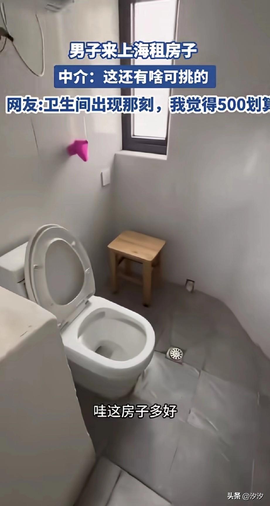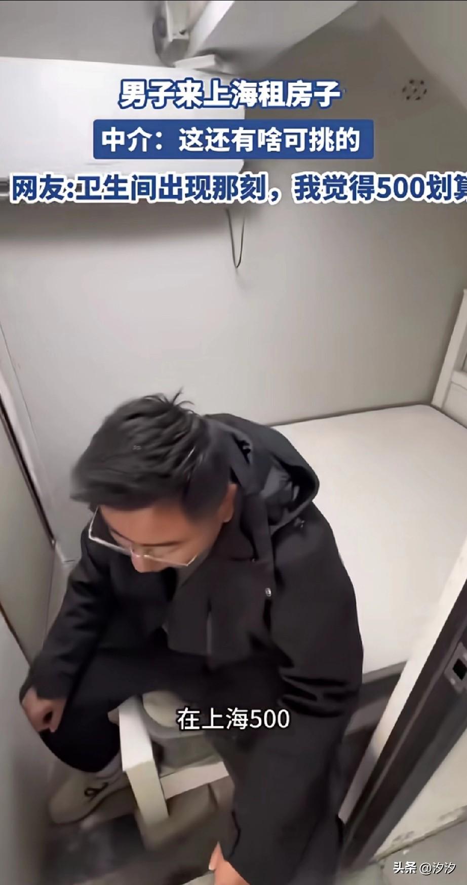 男子来上海租房, 结果被中介带到了一个便宜的房, 一个月就500块钱, 小伙子坐在房间的床上思考, 因为他兜里只有1100块, 这个房间确实不大, 只能放得下一张床, 还有一个5级能耗的空调, 最关键的是这个房子还带卫生间, 甚至有洗衣机还能洗澡, 卫生间感觉比房间还大, 虽然有点儿半地下室的感觉, 但确实还是很便宜的, 毕竟这可是寸土寸金的上次, 中介劝大哥不要再犹豫了, 赶紧签了吧, 他觉得和大哥有缘, 就不收大哥中介费了, 押一付一,大哥还能剩100, 网友看到后都笑了, 纷纷表示看到这个卫生间就觉得值! 不过有网友表示五能耗的空调, 电费不得3块钱一度, 大家觉得在上海租这样的房子划算不? 上海 上海中介套路 上海奇葩租房案