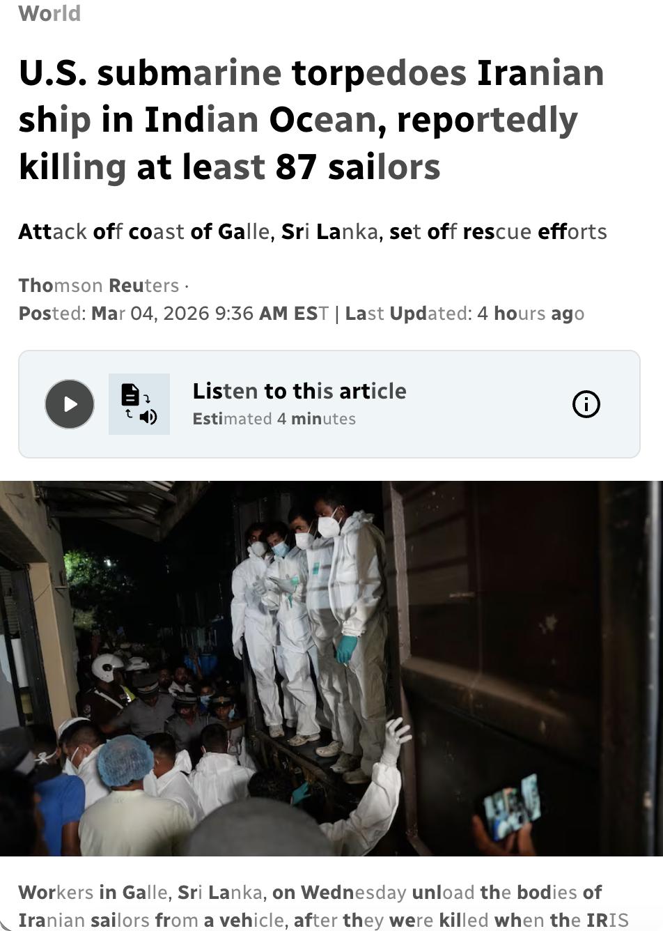 外媒:美国潜艇在印度洋斯里兰卡南部海域用鱼雷击沉伊朗护卫舰"IRIS Dena",造成至少87名船员死亡、约60人失踪,仅32人获救。 该舰当时正从印度东部港口返航伊朗,事发地点位于国际水域。美国战争部长赫格塞思证实攻击并称之为"安静的死亡",美军参谋长联席会议主席凯恩强调此举展示美国全球打击能力。 这是美伊冲突爆发以来美军击沉的第20余艘伊朗舰船,标志着华盛顿对伊朗海军的追击范围已从波斯湾扩展至印度洋远端。 这也是二战结束以来美国首次发射鱼雷击沉战舰。
