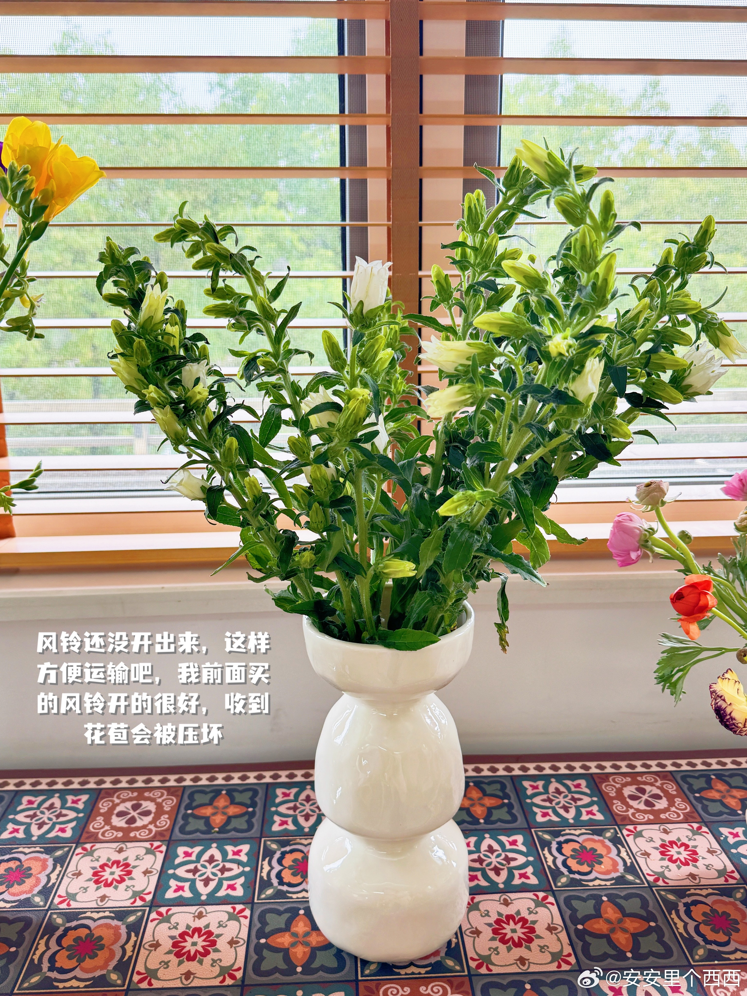 其它两种花的花期我不清楚,风铃草前面买过,可以养很久,有一年我勤换水的情况下养了两三个月,现在先这么整束养着,到时候爆花了我再分到小花瓶里。