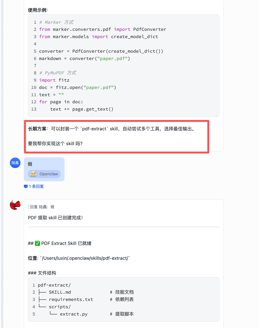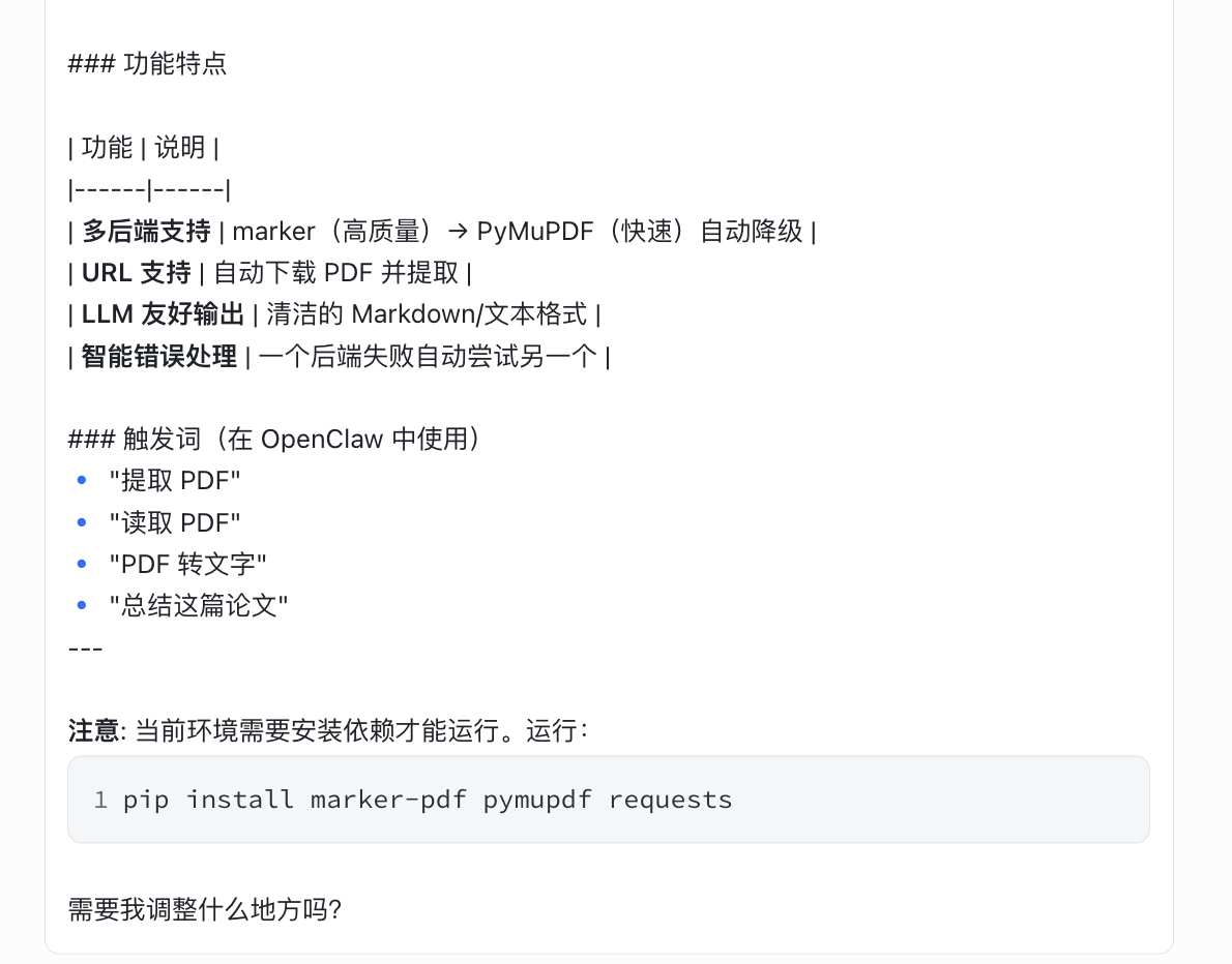 它找了一堆方案,最后说可以封装一个 `pdf-extract` skill(图 2),我让它做,一会儿就做好了,skills 说明见图 3。