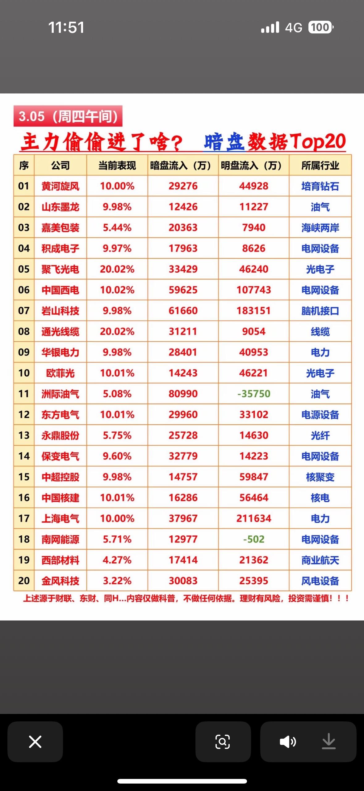 3月5日主力资金动向一直是大家关注焦点。暗盘数据Top20就像神秘宝藏,揭开它能发现很多秘密。 从暗盘数据看,某些科技股赫然在列。比如有一家新兴的人工智能企业,主力资金大量流入,或许是看中其未来发展潜力。还有传统制造业的一家公司也在Top20里,可能是因为其稳定的业绩和行业地位吸引了主力。 不过,暗盘数据只是参考。主力偷偷布局,我们小散也得擦亮眼睛,不能盲目跟风,多分析背后逻辑,才能在投资路上少踩坑。