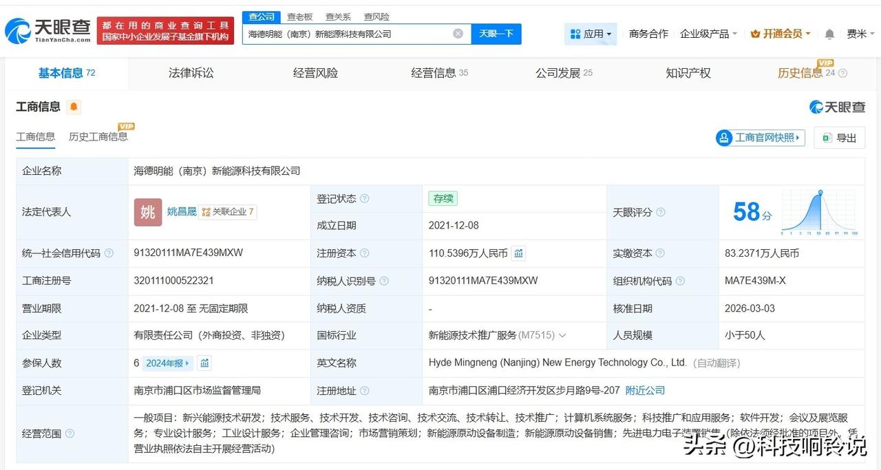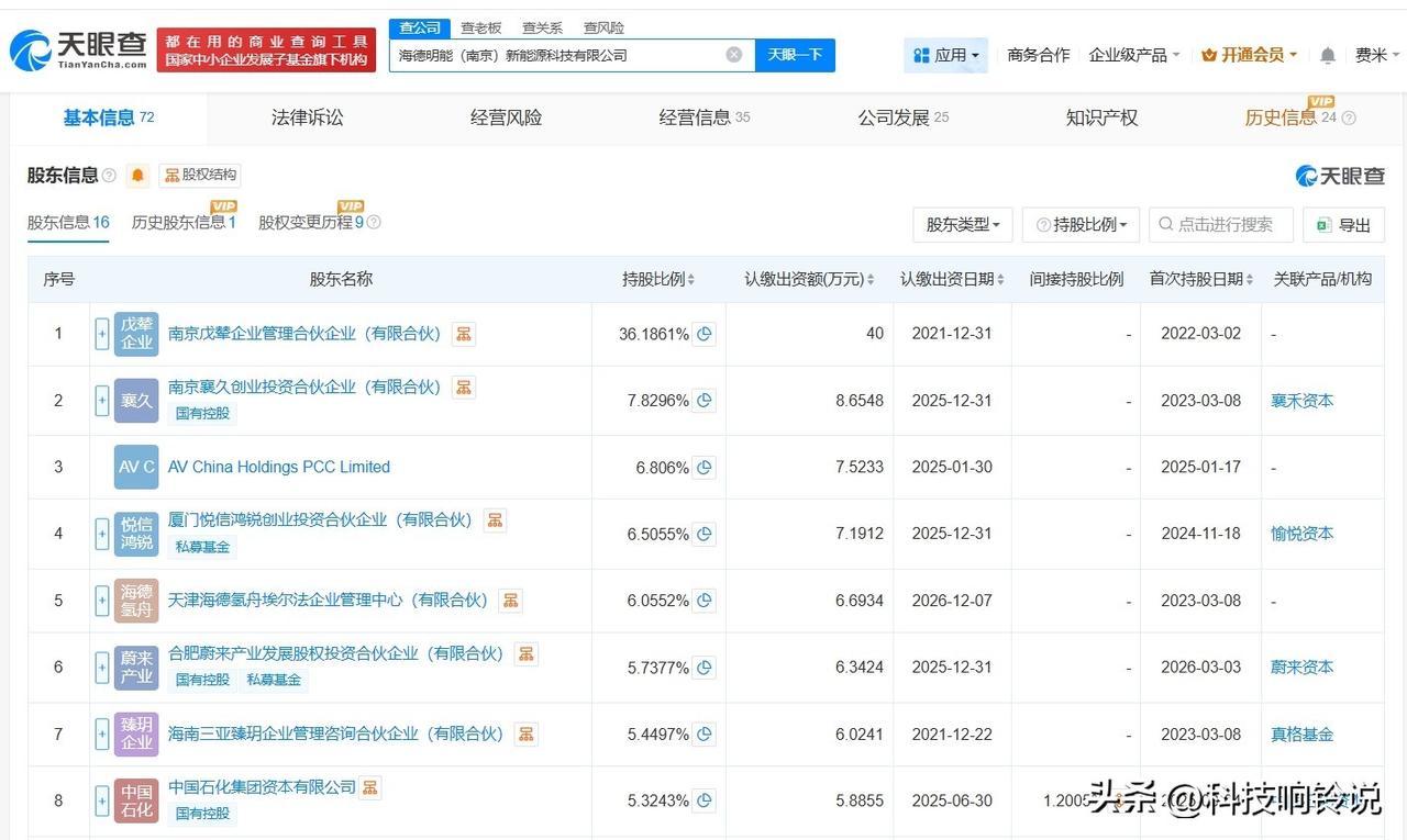【蔚来资本等入股海德明能】 天眼查工商信息显示,近日,海德明能(南京)新能源科技有限公司发生工商变更,新增蔚来资本旗下合肥蔚来产业发展股权投资合伙企业(有限合伙)、厦门雅恒创业投资基金合伙企业(有限合伙)等为股东,注册资本由约96.6万人民币增至约110.5万人民币,同时,多位主要人员发生变更。 海德明能(南京)新能源科技有限公司成立于2021年12月,法定代表人为姚昌晟,经营范围包括新兴能源技术研发、新能源原动设备制造、新能源原动设备销售等。股东信息显示,该公司现由南京戊辇企业管理合伙企业(有限合伙)、南京襄久创业投资合伙企业(有限合伙)及上述新增股东等共同持股。 天眼查信息: