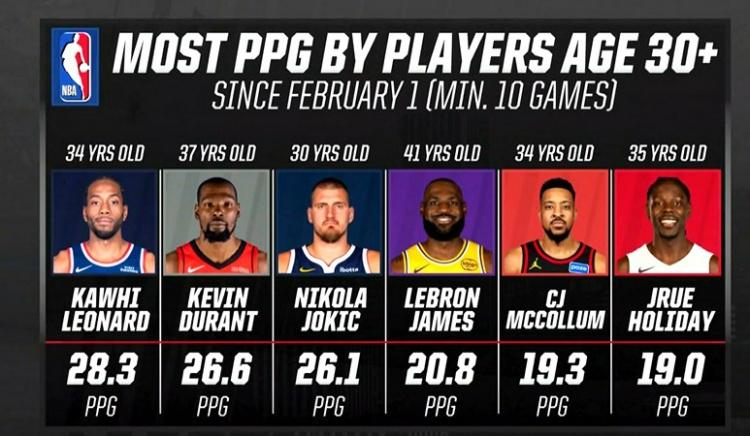 2026年“老将”场均得分榜: 1、伦纳德(34岁)——28.3分 2、杜兰特(37岁)——26.8分 3、约基奇(30岁)——26.1分 4、詹姆斯(41岁)——20.8分 5、CJ麦科勒姆(34岁)——19.3分 6、霍乐迪(35岁)——19分 (老将:年龄30岁以上) 这6个人里,排名前三的小卡、杜兰特、约基奇都还是各自球队的绝对核心,詹姆斯、CJ、霍乐迪都是第二、第三选择,得分也和前面三位有了档次上的差距。 从年龄上看,詹姆斯和杜兰特都是高龄球员了,30岁以上的球员不算少,但他俩还能在前6里面,杜兰特甚至高居第二,确实展现了非同一般的得分能力。 以前说詹姆斯和杜兰特是联盟“大小王”,现在老了,但看着依然比大部分的球员要强得多。