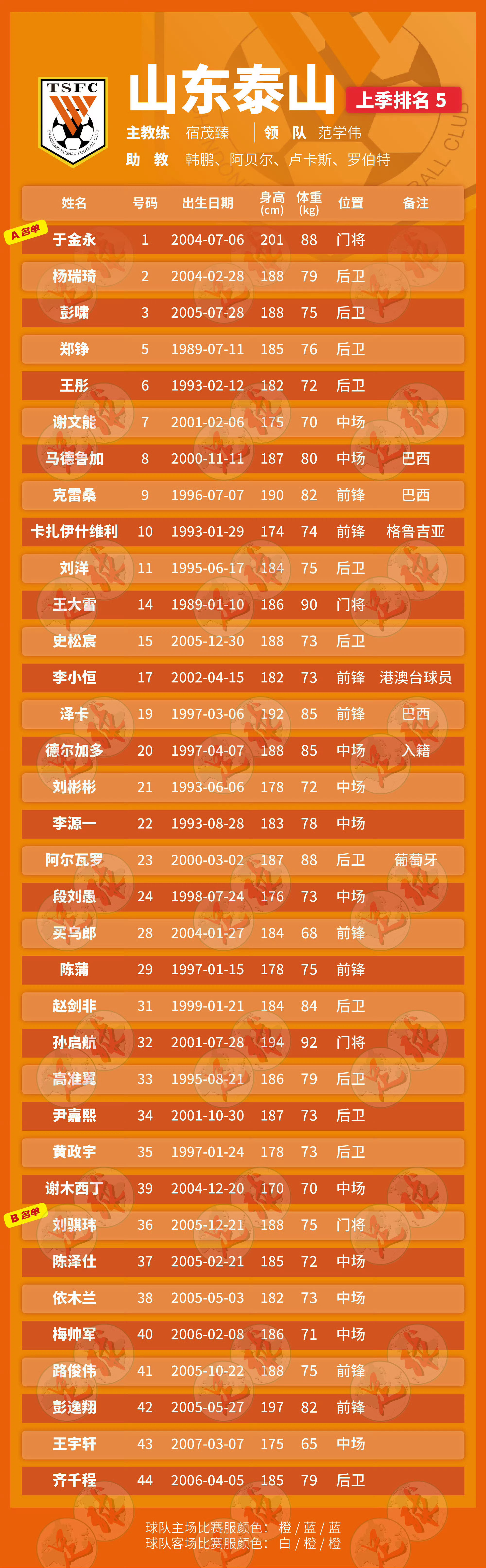 官方发布:2026赛季山东泰山队大名单