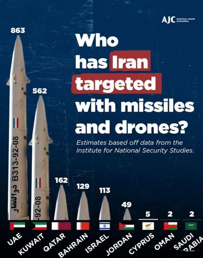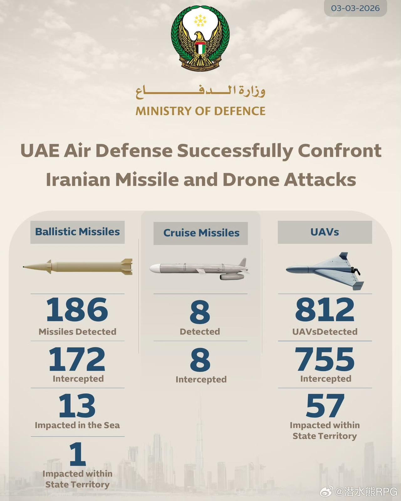 美以联军打伊朗,阿联酋最受伤,伊朗近50%的导弹和无人机打向了阿联酋。 在美以联军对伊朗发动空袭后,伊朗的报复性反击中,阿联酋意外成为“最受伤”的国家——约50%的导弹和无人机集中砸向这片富庶之地,而根源竟与阿联酋境内庞大的美军基地直接相关。 打击强度远超他国,根据各国国防部统计,伊朗向阿联酋倾泻了近半数火力: 导弹与无人机数量:阿联酋共探测到186枚弹道导弹和812架无人机,占伊朗对9国总发射量的近50%。 拦截与漏网:虽成功拦截172枚导弹和755架无人机,但仍有1枚导弹和57架无人机突破防线落入境内。 对比数据:其他海湾国家如卡塔尔、巴林同期遭袭规模仅为阿联酋的1/3至1/5。