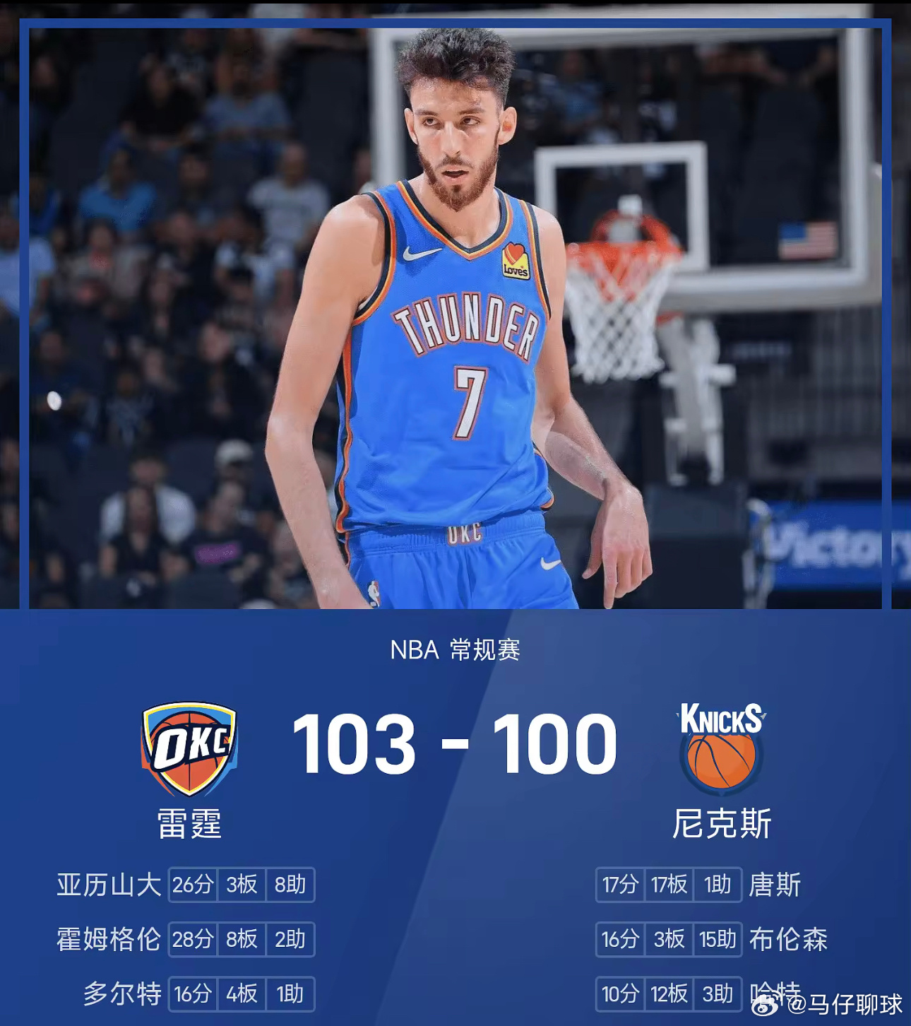 03月05日讯 25/26赛季NBA 常规赛,尼克斯对阵雷霆。双方全场战罢,尼克斯100-103不敌雷霆。霍姆格伦砍下全场最高的28分8板2助,率领雷霆成功取胜。