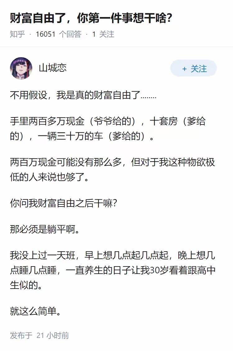 当然是财富自由啦,如果这个是真的,只要不碰投资,不娶物质女,可以潇洒的活一辈子