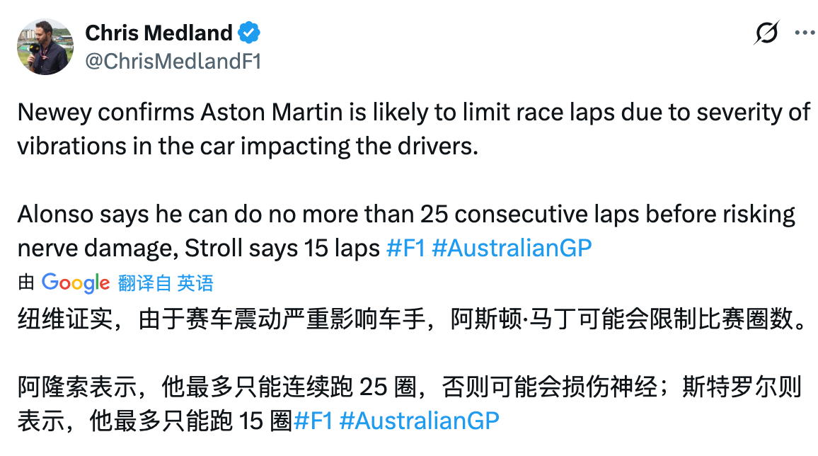 纽维在周四的媒体会上表示,阿斯顿马丁赛车遇到了非常严重的振动问题,可能会因此限制正赛的里程