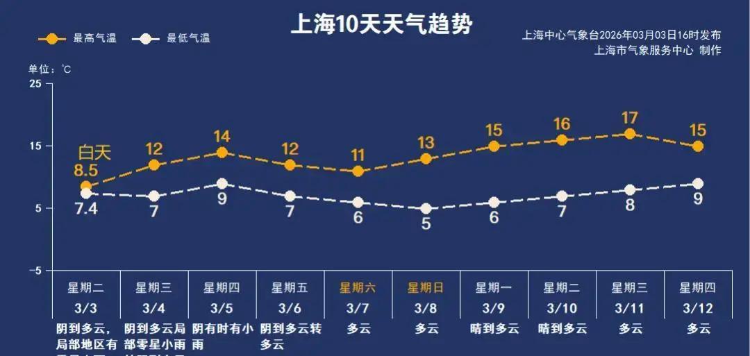 3月4日上海,入春已来气温却偏低,阴雨天气又卷土重来,体感寒意难消! 最高气温12℃,但夜间最低7℃,偏北风吹得人直发抖,早晚出门需多加衣物。未来几天,周三到周四小雨频现,周五雨停,周末转多云,阳光渐现。 本周整体温差大,夜间易感冒,建议“春捂”不减防寒层。下周天气好转,最高温超15℃,春意将浓。注意天气多变,及时查预报,健康第一莫大意。
