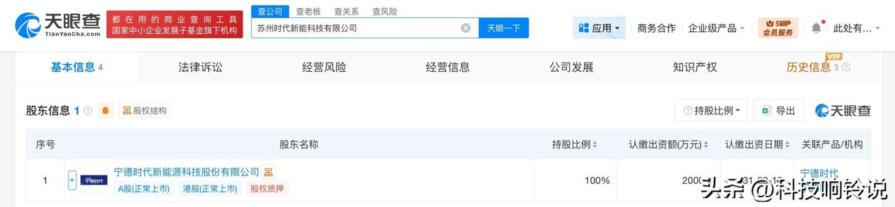 【宁德时代在苏州成立新科技公司 注册资本20亿】 天眼查工商信息显示,3月5日,苏州时代新能科技有限公司成立,法定代表人为陈凌,注册资本20亿人民币,经营范围包括新兴能源技术研发、电池制造、电池零配件生产、电子专用材料制造等。股东信息显示,该公司由宁德时代(300750)全资持股。 天眼查信息: