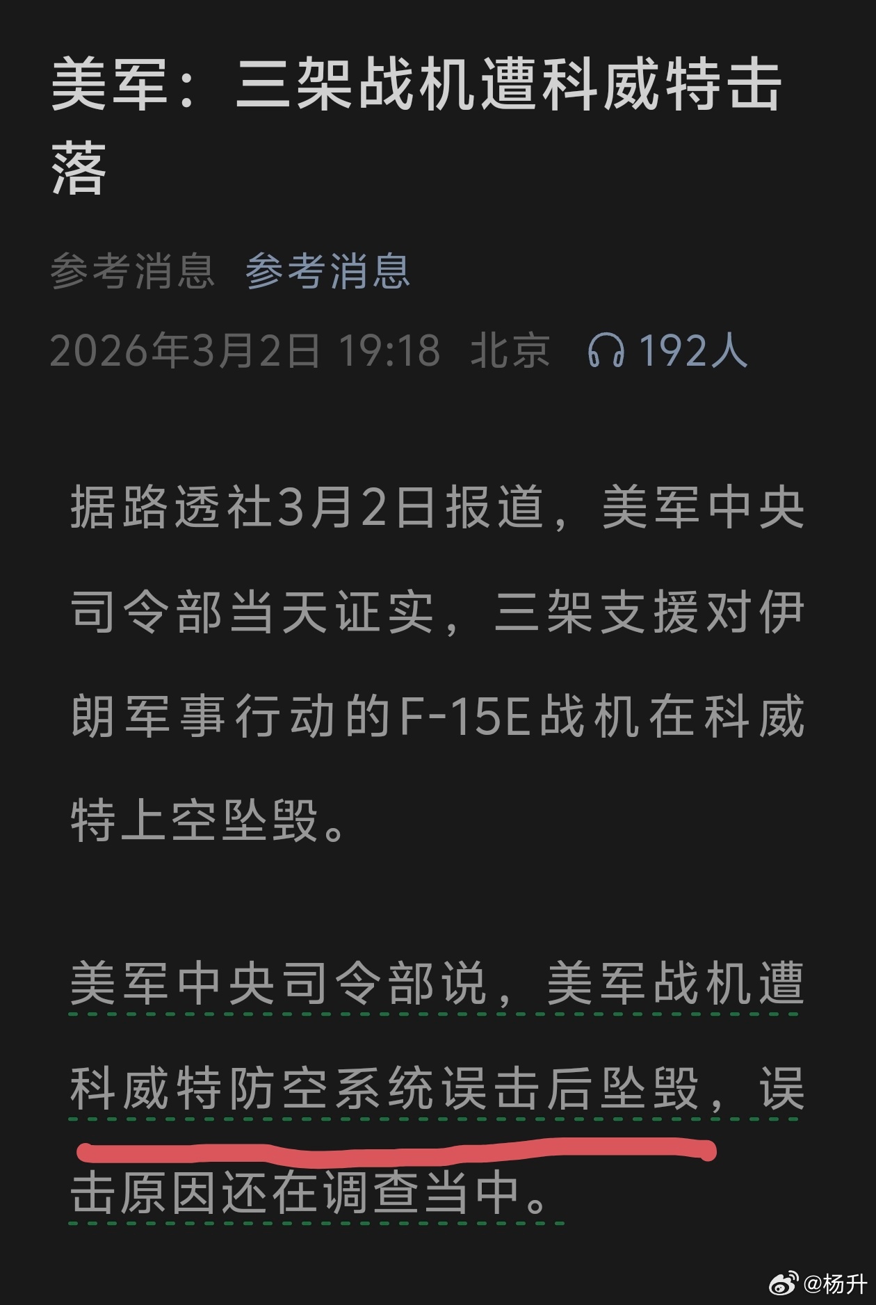 我说怎么都在科威特那边打下来了,原来是科威特自己的防空系统干的 ,至少美国🇺🇸自己是这么说的,目前还没听到伊朗🇮🇷的说法,如果是误击,一次性误击三架也是有点搞笑