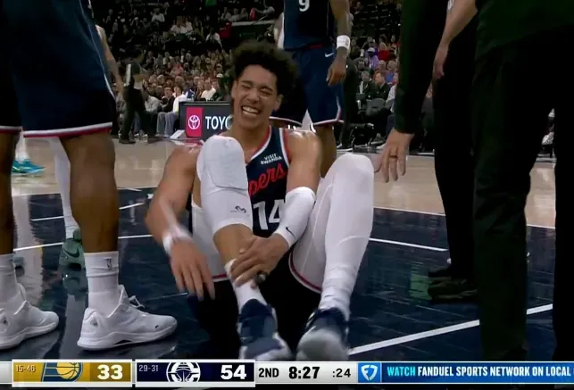 第二节比赛中,尼德豪泽落地右脚受伤,右腿不能落地被架出场。