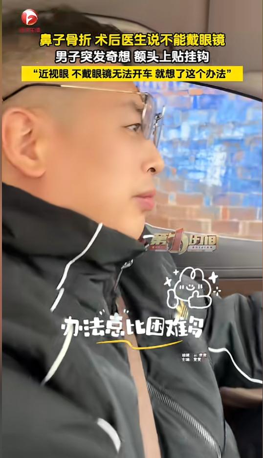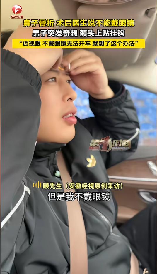 “万万没想到!”近日,山东临清,一男子打篮球时被撞,导致鼻子骨折,手术后,医生说不能够戴眼镜。可该男子近视很厉害,不戴眼镜车都开不了。该男子突发奇想,给自己前额上贴了一个挂钩,把眼镜挂了上去!网友:虽然很招笑但确实有用! 受了伤总会给日常生活带来些不便,哪怕不是特别严重,在康复期也总会带来些小麻烦,这时候,不少人就脑洞大开,八仙过海各显神通。 据媒体3月5日报道,不久前,顾先生在打篮球时不小心被人肘击了一下,鼻子当场骨折,被送去了医院。检查过后,医生很快给安排了手术,问题也不大,就是手术后恢复期内,鼻梁没有支撑功能,不能戴眼镜。 这问题看似不大,却把顾先生难为坏了。他是个近视眼,不戴眼镜连车都开不了。他又不会戴隐形眼镜,小问题造成了个大麻烦。 为了解决这个问题,顾先生冥思苦想,一番思索过后,他突然想到,鼻子既然不能支撑,我用东西把眼镜吊起来,不让它碰着不就成了。 就这样,顾先生找来了家里的便利粘钩,确定好位置后,小心翼翼地把它粘在了自己额头上。随后他带上眼镜,眼镜中间的连接位置正好挂在挂钩上,完美避开了鼻子。效果非常的好! 网友看后表示,真是个人才啊,这走出去,回头率得百分之一千啊!活脱脱一个现眼包!内向的人可学不来,还是老老实实学着戴隐形眼镜吧! 信息来源:《鼻子骨折术后医生说不能戴眼镜,男子突发奇想额头上贴挂钩,近视眼不戴眼镜无法开车于是就想了这个办法。》AHTV第一时间