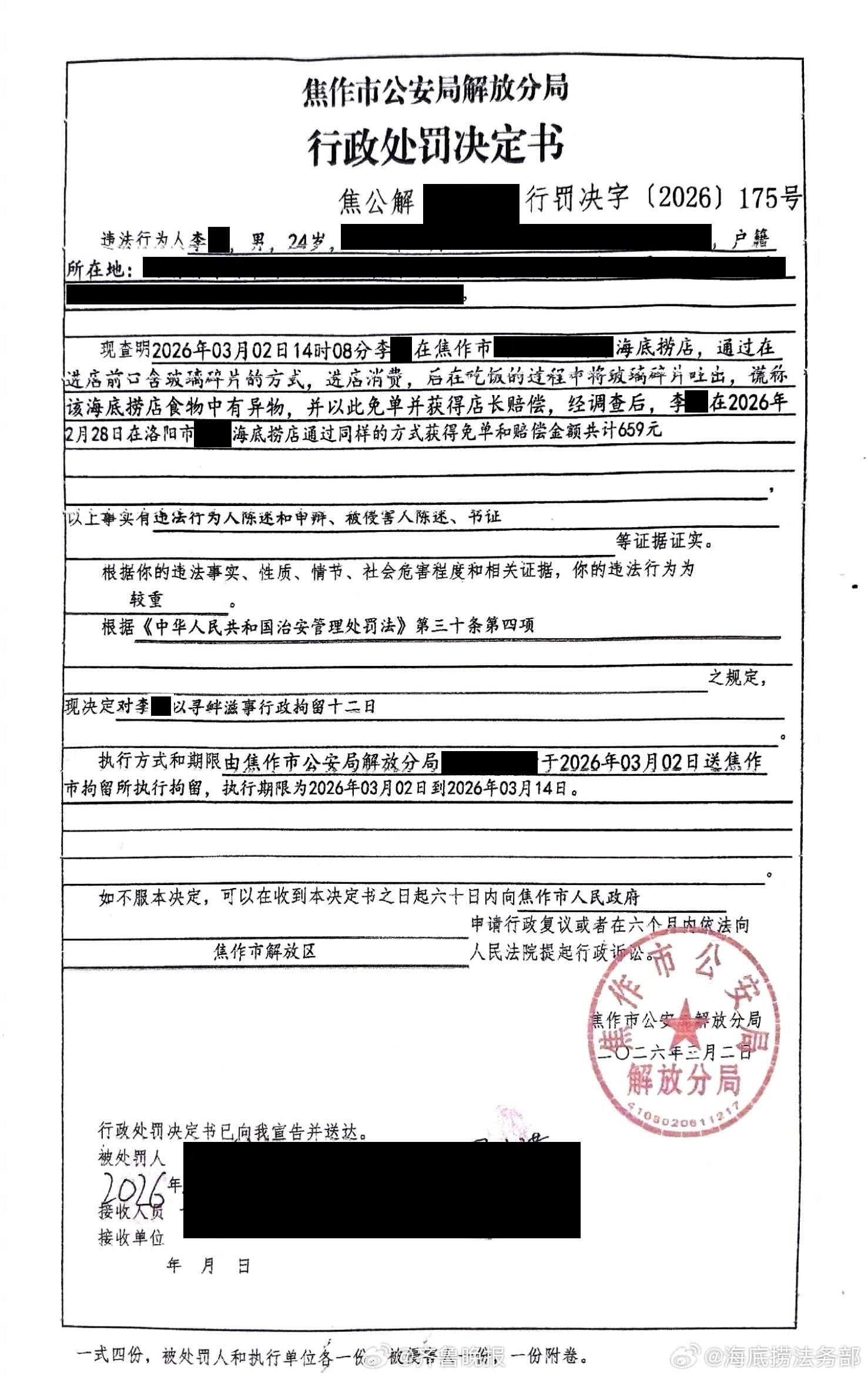 #男子口含玻璃碎片敲诈海底捞被行拘#【#海底捞公布两起故意投放异物事件#】据消息:近期,两家海底捞火锅门店先后发生相关人员在用餐过程中故意投放头发、玻璃碎片,并以此为由投诉索赔、扰乱正常经营秩序的事件。