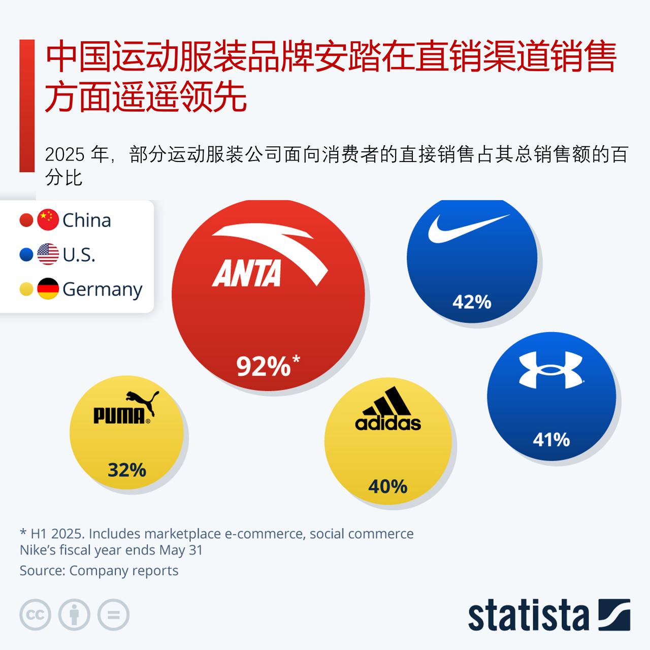 亚洲运动服装品牌在股市上崭露头角,中国安踏在直销渠道销售方面遥遥领先 特朗普政府在 2025 年发起的贸易战造成了这样一种局面:美国和欧洲的企业遭受了损失,而亚洲的竞争对手则从中受益,因为它们在同一市场进行生产和销售。在运动服装领域,市场领先企业的股价与两年前相比大幅下跌。例如,耐克、阿迪达斯和彪马都受到了影响。虽然耐克近期的营收也有所下降,但阿迪达斯的热门产品(最近以复古运动鞋为首)去年仍实现了创纪录的销售额和利润率,但仍未得到投资者的看好。彪马的市值和营收也有所下降,但目前正处于重组过程中。 与此同时,中国的体育巨头安踏的营收和股价均有所增长,其竞争对手李宁的股价也有所上涨。安踏控股的亚玛芬体育公司的股价大幅飙升,该公司拥有始祖鸟、阿托米克、萨洛蒙和威尔胜等品牌,此外,日本的亚瑟士公司也凭借复古潮流推出了鬼冢虎和运动时尚休闲鞋等运动鞋,从而实现了股价的上涨。 虽然耐克、阿迪达斯和彪马等国际运动服装巨头之间存在激烈的竞争关系,但它们有一个共同点:都在努力摆脱中间商环节。作为这一策略的一部分,阿迪达斯表示其目标是在 2025 年之前将直接面向消费者的业务占其总销售额的一半,但其未能实现这一目标,差距达 10 个百分点。在其最近的财政年度中,直接面向消费者的销售额占总销售额的 42%,行业领军者耐克在向以直接面向消费者模式为主的未来转型方面领先一步,但其比例从 2023 年的 44%有所下降。 中国体育用品巨头安踏正逐渐逼近竞争对手,并且近期其营收已超过了彪马,成为全球第三大运动服装生产商。根据其 2025 年中期报告,在开展了一项积极的营销活动之后(同时充分利用了蓬勃发展的中国在线市场和社交电商环境),安踏的直接面向消费者的销售额已达到 92%。 六年前,运动服装生产商的直接面向消费者销售份额要低得多,耐克为 32%,阿迪达斯为 33%。而彪马的表现则令人惊讶地落后很多,2019 年其这一比例仅为 25%,到 2025 年更是降至 32%。安踏在 2020 年就已公布了其直接面向消费者的销售额数据,当时这一比例已达 42%。 虽然直接面向消费者销售有可能推动公司的利润增长和业务拓展,但同时也伴随着一系列新的挑战。无论是将单个包裹直接寄送给消费者,而非批量寄给批发合作伙伴,还是处理退货事宜,又或是充分利用所获取的客户反馈信息——要在这种规模下高效运营直接面向消费者的业务,就需要在营销和供应链管理方面进行大量投资。