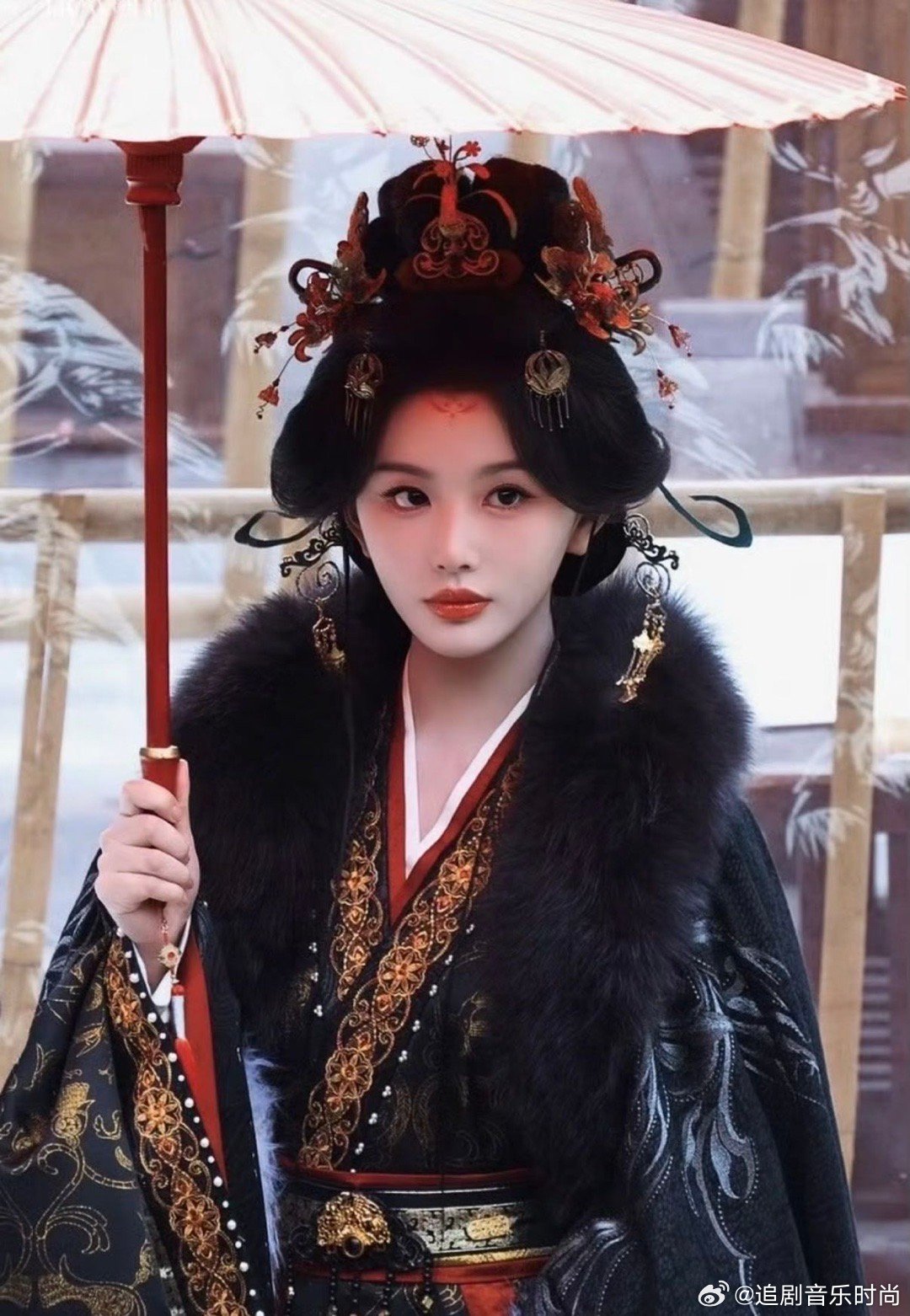 孔雪儿撑伞又出神图黑金着装配额上一抹红,雪中撑伞眼神带杀气,这不就是女帝本帝吗?孔雪儿这张脸真的太适合这种又贵又冷的角色了,看一眼就想跪下喊陛下。