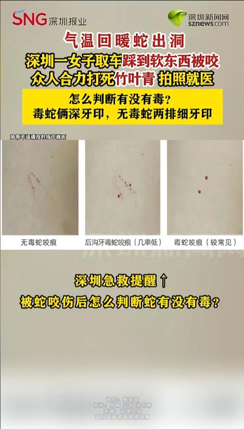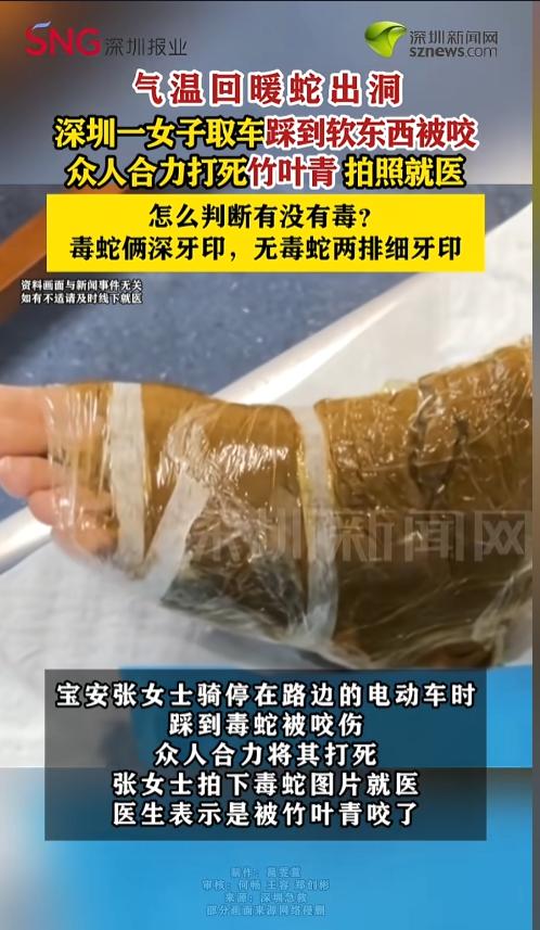 “太吓人了!”近日,广东深圳,一女子在取电动车时踩到一个软软的东西,随后感到一阵剧痛。她低下头一看,竟然是一条蛇。她和周围的人一起把蛇打死,拍了照片,然后赶紧去了医院。医生说这是竹叶青,给女子打了抗毒血清。网友:最近得多加小心! 都说过了惊蛰,动物们冬眠才结束,各种蛇虫才开始活跃。不过动物们看的可不是日子,而是温度。随着近些年气温逐渐升高,动物们也开始提前活跃了。 据媒体3月5日报道,不久前,张女士准备骑电动车出门,她去推车时,突然觉得脚下的杂草感觉不对,随后脚上传来一阵剧痛。仔细一看,自己被一条蛇咬了。张女士赶紧和周围的人把蛇打死,拍完照片后,径直赶往了医院。 医生看了看照片,又做了检查,确认是被竹叶青咬伤了。这是一种剧毒毒蛇,医生赶紧给安排注射了抗毒血清,又住院观察了几天。几天后,张女士出了院,但脚部依旧还肿着。 每年惊蛰前后,蛇咬人事件大量发生,不少人因此丢掉了性命。那如何判断有没有毒呢?其实也很简单,若是伤口上是两颗深深的牙印,确定是毒蛇无误,一定要立即前往医院就医。如果伤口是浅浅的两排牙印,那就不用太担心,这蛇没毒。 还有一种情况比较特殊,那就是后沟牙毒蛇,它的毒牙长在后面,咬出来的伤口和无毒蛇的伤口有些类似,也有两排浅浅的牙印,但它的伤口附近,往往还伴随着两个深一点的牙印,这就是它的毒牙造成的。 在这里也提醒大家,见到蛇一定要离的远一些。若不幸被咬伤,当自己无法明确确认蛇是无毒的情况下,一定要去医院进行检查,同时记得拍下蛇的样子,供医生参考,让医生能更快更准的做出判断,加快治疗进度! 信息来源:《【