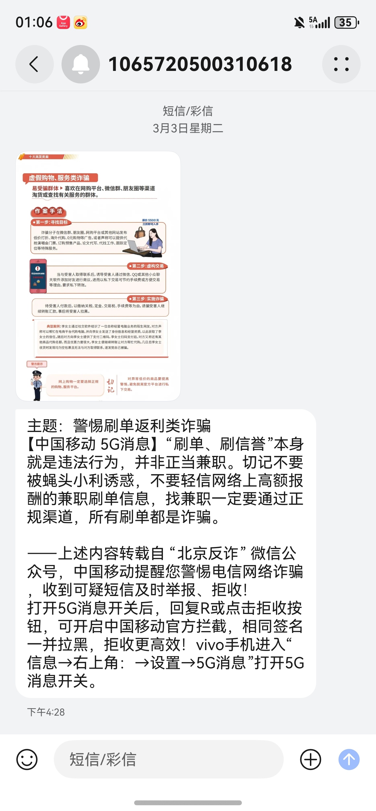 短信提醒防止电信诈骗,不要去相信刷单赚钱啥的,不贪心就不会被骗。大家一定要小心。