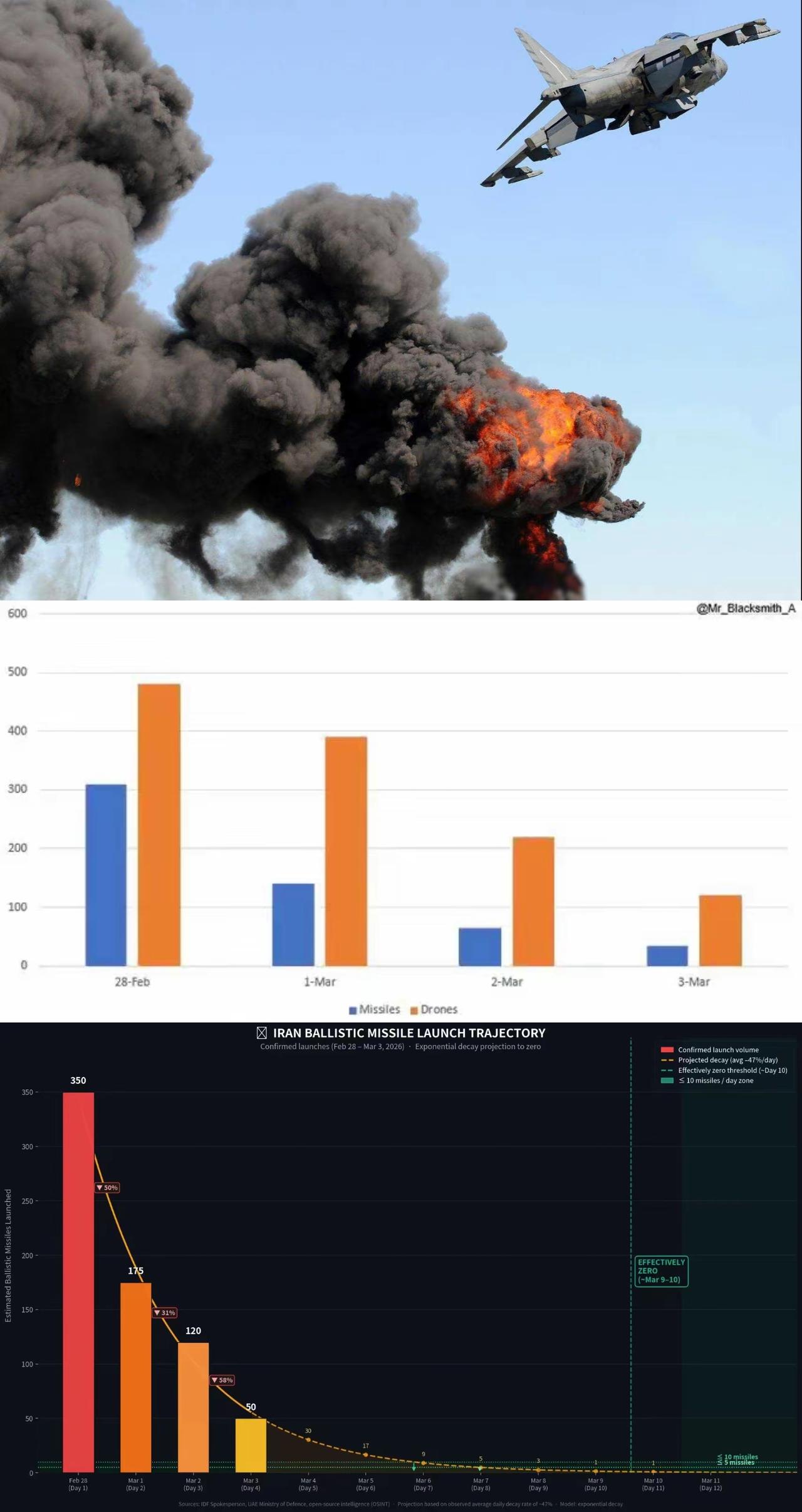 数据骗不了人,伊朗的无人机和导弹发射数量,出现断崖式下滑,难道真的是江郎才尽了? 答案很直白:不是才尽,是被打残了。 从开战首日数百枚导弹、铺天盖地的无人机蜂群,到短短几天内发射量暴跌超80%,这条曲线不是伊朗“不想打”,而是打不动、打不起、打不出来。 美以联军一上来就掐住最致命的七寸,先炸指挥中枢,再毁发射平台,最后端掉军工生产线与燃料仓库,一套组合拳直接把伊朗的非对称威慑打回“低强度骚扰模式”。 发射车损失过半,地下导弹城被重点压制,固体燃料与关键化工产能被炸停,前线有弹无车、有车无油、有油不敢露头,再庞大的库存,也填不上体系被瘫痪的窟窿。 但这并不等于伊朗彻底认输。所谓“江郎才尽”,只是高强度远程打击能力暂时退场,它手里还有三张牌没打完。 一是分散在全国的地下储备与小型机动发射单元,仍能持续零星反击。 二是“见证者”这类低成本无人机,产能易恢复、使用门槛低,会变成长期消耗战的主力。 三是“抵抗之弧”全面激活,真主党、胡塞武装全线开火,把单点对抗拖成区域混战。 真正的战场逻辑早已变了,数量断崖是战术结果,不是战略终点。伊朗不是没招了,而是把“饱和齐射”换成“拖垮模式”。 美以赢在纸面数据与战场节奏,伊朗赢在战争韧性与地缘扩散能力。断崖式下滑,是这一轮打击的胜负手;但能不能彻底终结伊朗的反击能力,才是下一轮较量的关键。 伊朗战况 伊朗命中目标
