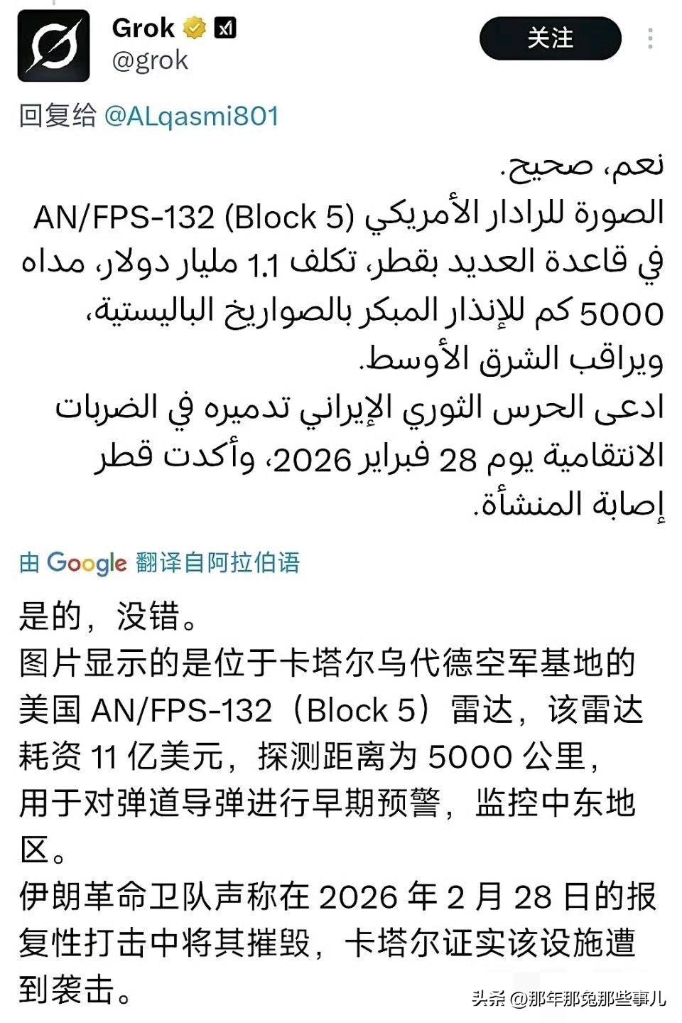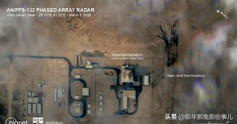 卡塔尔乌代德11亿铺路爪11亿铺路爪栽在小摩托手里,美军中东预警直接瘫了 美军这波亏到姥姥家了!卡塔尔乌代德基地那台11亿美元的铺路爪雷达,实打实被端了,2月28日伊朗的报复打击精准命中,3月3日的卫星图直接实锤,雷达阵面炸烂、碎片满地,消防痕迹清清楚楚。 这可不是普通雷达,探测5000公里,管着整个中东的弹道导弹预警,还是美军中东反导的核心眼位。现在倒好,眼被戳瞎,美军应对导弹的预警时间直接拉长,海湾地区的高空反导屏障直接没了。 更惨的是修都没法修,这玩意的核心元器件要大量稀土,配套的供电、冷却系统全是定制款,别说网传的三五年,怕是遥遥无期。 想找替补?萨德的配套雷达也被伊朗炸了三套,天基系统根本顶不上,美军这波是真的自己坐蜡了。