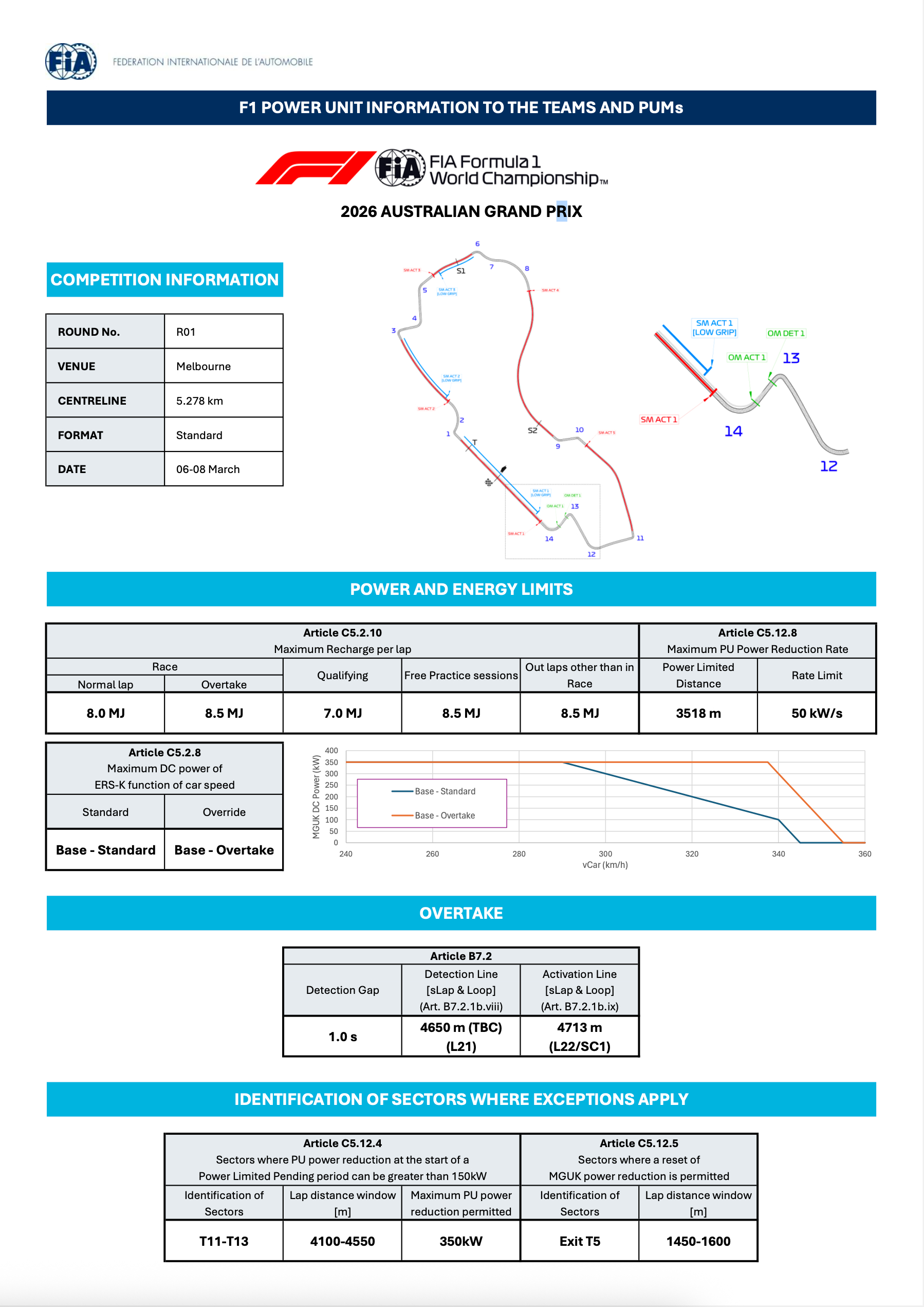 赛道动力限制区域长度:3518m(新规正常情况下,赛车会在电量即将耗尽的情况下最多削减150kW电力输出,并至少保持1秒的时间,让车手感知到赛车电量耗尽,随后电机输出将会快速下降。)最大电力输出下降速度:50kW/s(超过3.5km的赛道均为50kW/s,低于3.5km的赛道为100kW/s)