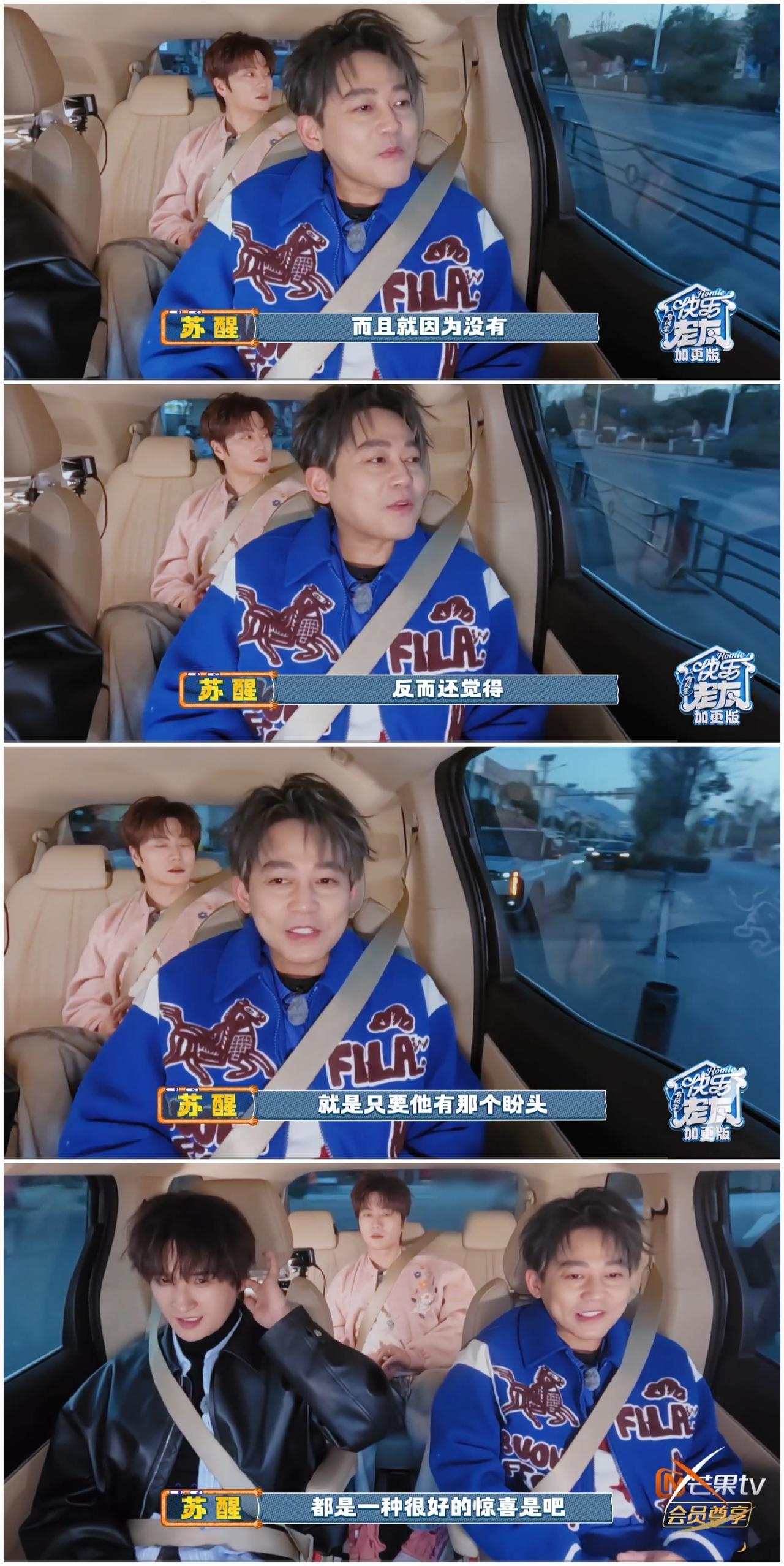 苏醒,张远,陆虎车上闲聊, 苏醒谈及此事, 言语间满是不甘。 眼看陆虎已经红了十几首歌, 苏醒却没有什么代表作。 刚开始苏醒还是有点怨天尤人, 但是后来他就看开了, 觉得歌曲不红, 也是一种好事。 这样让自己生活有个盼头。 苏醒坦言陆虎是无法体会他的心境的, 苏醒没有什么歌是红的, 万一有一天, 有一首歌突然红了, 那就是莫大的惊喜, 就冲着这个, 让苏醒每天都有冲劲。 是呀, 人生总是需要有点遗憾, 不能什么都那么满。 苏醒虽然富有, 但是他没有代表作, 没有女儿。 这些就是他心中的期盼 事情, 他不把这些当作是一件坏事, 反而把这些当作一件好事, 为了填补这些遗憾, 他不断努力, 让自己生活有奔头, 那个期盼的过程满是刺激。
